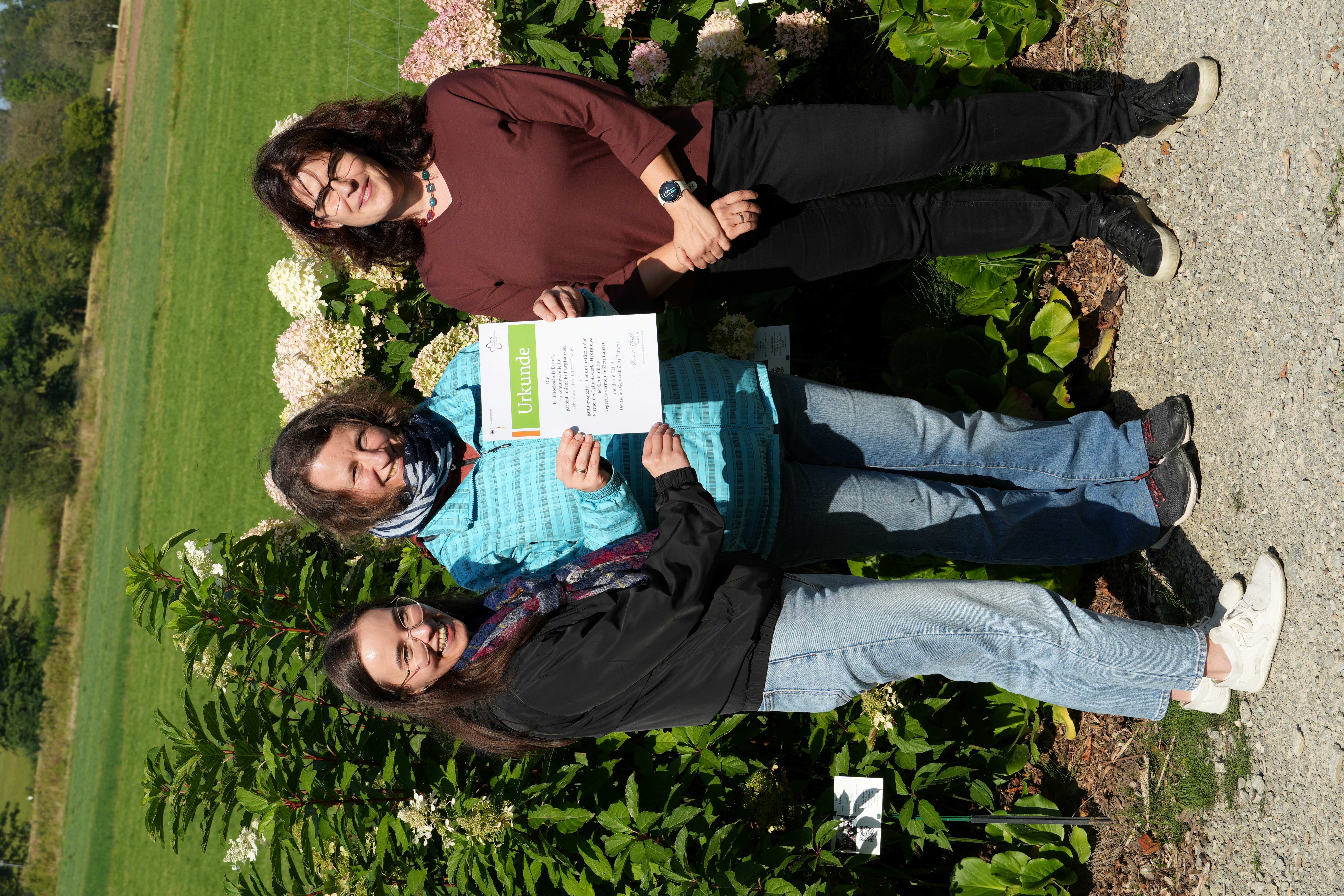 Im Bild: Am 17.09.2024 nahmen Frau Dr. Conny Tränkner und Frau Tanja Harraß von der Forschungsstelle für gartenbauliche Kulturpflanzen (FGK) der Fachhochschule Erfurt im Hortensien-Naturpark Erbsmühle in Großalmerode die Beitrittsurkunde durch Frau Katja Näthke vom Bundessortenamt entgegen.