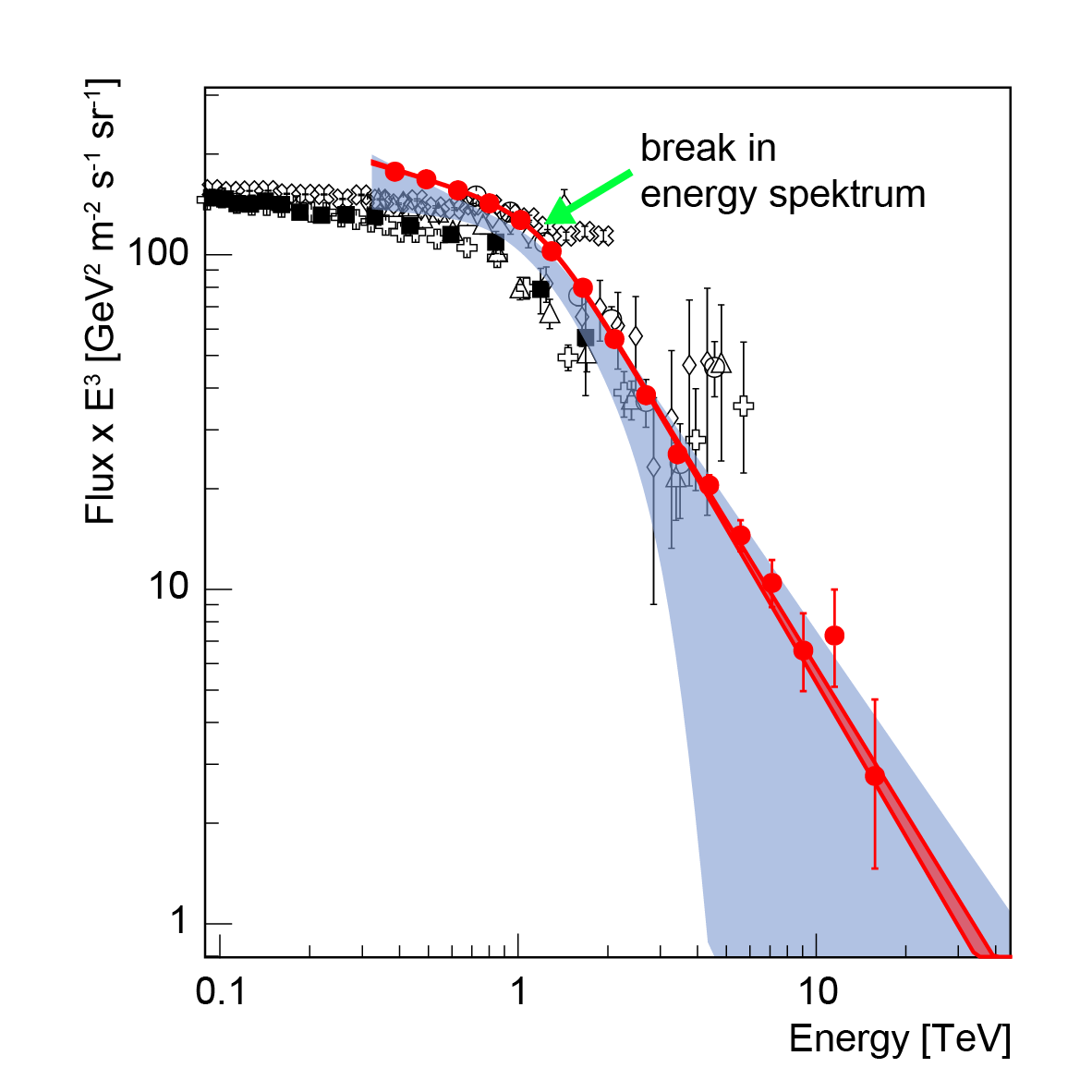 The researchers found, however, that the transition from a shallow to a steep decline at about 1 Tera-electronvolt is surprisingly sharp.