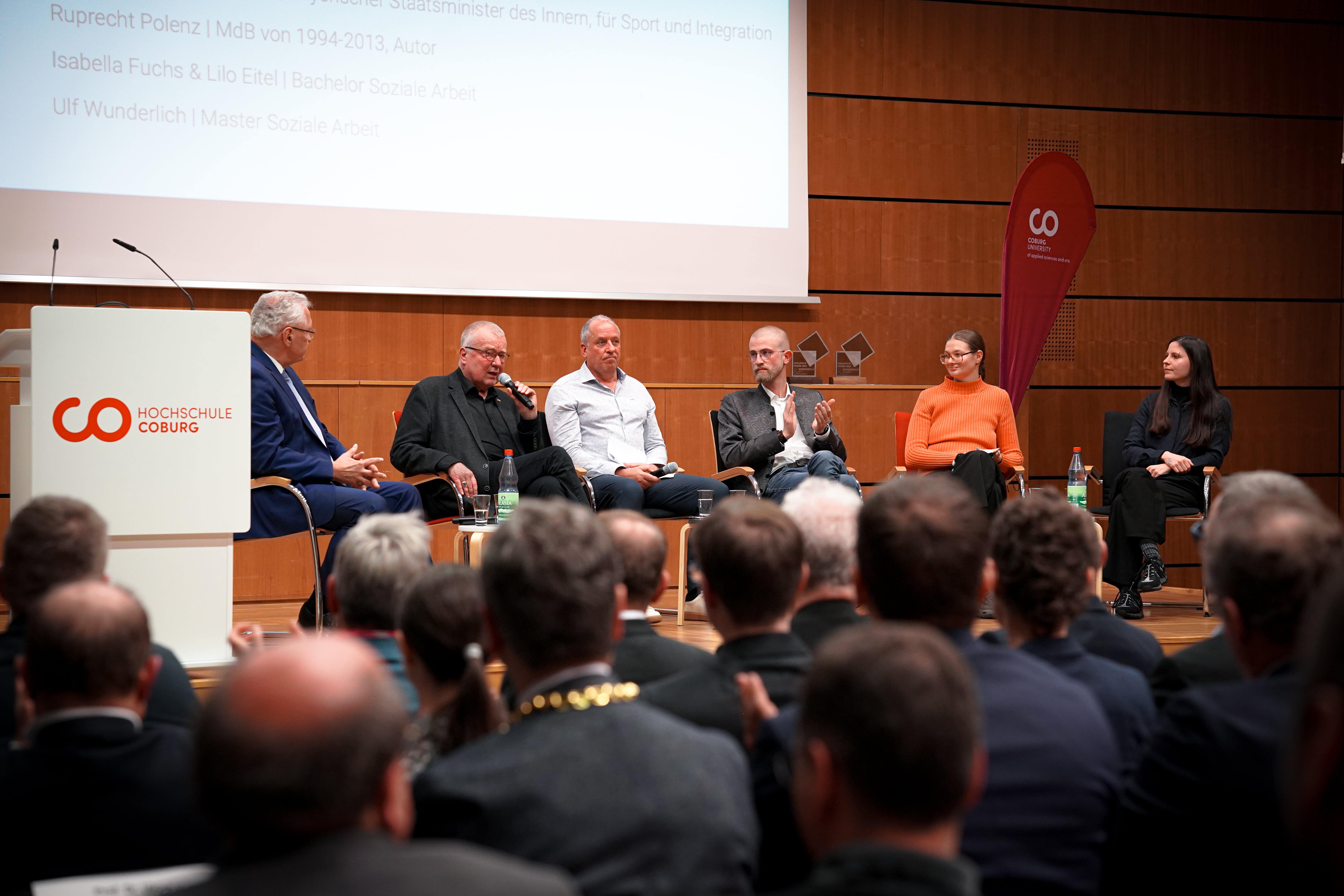 Lilo Eitel nimmt das Mikrofon und sagt „Hallo“. Sie lacht. Klingt kurz nervös. Etwa 250 Menschen lauschen dem Podiumsgespräch beim Dies academicus der Hochschule Coburg: Sie kommen aus Medien, Politik, Gesellschaft und Wirtschaft, Wissenschaft und der Hochschule selbst – und auf der Bühne bei Moderator Andreas sitzen neben den Studierenden bekannte Persönlichkeiten: Joachim Herrmann, Bayerischer Staatsminister des Innern, für Sport und Integration, der dienstälteste Innenminister aller Bundesländer und seit 2007 im Amt. Außerdem Autor Ruprecht Polenz, als Politiker unter anderem selbst fast 20 Jahre lang Bundestagsmitglied und als „Demokratie-Influencer“ mit seinem aktuellen Buch „Tu was!“ auf der Bestsellerliste gelandet. Unter dem Motto „Demokratie und Freiheit in Gefahr!?“ sprechen die prominenten Gäste bei der Podiumsdiskussion mit drei Studierenden der Hochschule: Ulf Wunderlich studiert im Master Soziale Arbeit und ist Vorsitzender der Studierendenvertretung, Isabella Fuchs und Lilo Eitel sind im fünften Semester des Bachelorstudiengangs Soziale Arbeit.