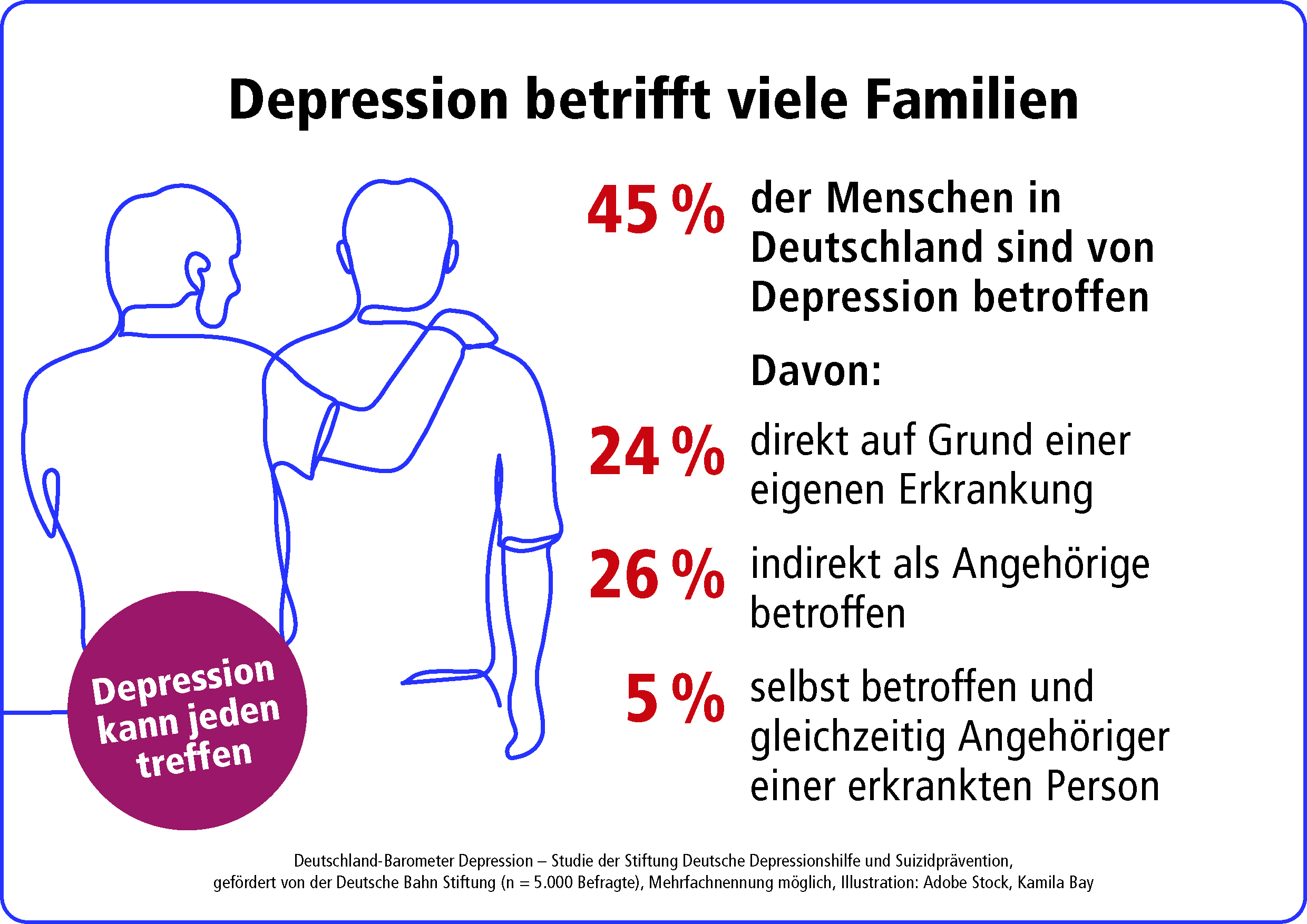Leipzig, 26.11.2024 – 45 Prozent der Bundesbürger sind von Depression betroffen: entweder direkt aufgrund einer eigenen Erkrankung (24%) oder indirekt als Angehöriger (26%). Wobei 5 Prozent selbst betroffen und gleichzeitig Angehörige einer erkrankten Person sind. Die Familie ist für viele Betroffene eine wichtige Stütze auf dem Weg durch die Erkrankung. Rund drei Viertel der Angehörigen beschreibt die Depression jedoch auch als große Belastung für das Familienleben. Dabei werden die Angehörigen noch zu selten (16%) in die Behandlung einbezogen. Das zeigt das heute veröffentlichte 8. Deutschland-Barometer Depression der Stiftung Deutsche Depressionshilfe und Suizidprävention. Die Befragung untersucht jährlich Einstellungen und Erfahrungen zur Depression in der erwachsenen Bevölkerung. Befragt wurde im September 2024 ein repräsentativer Bevölkerungsquerschnitt aus 5.000 Personen zwischen 18 und 69 Jahren. Die Studie wird gefördert von der Deutsche Bahn Stiftung gGmbH.