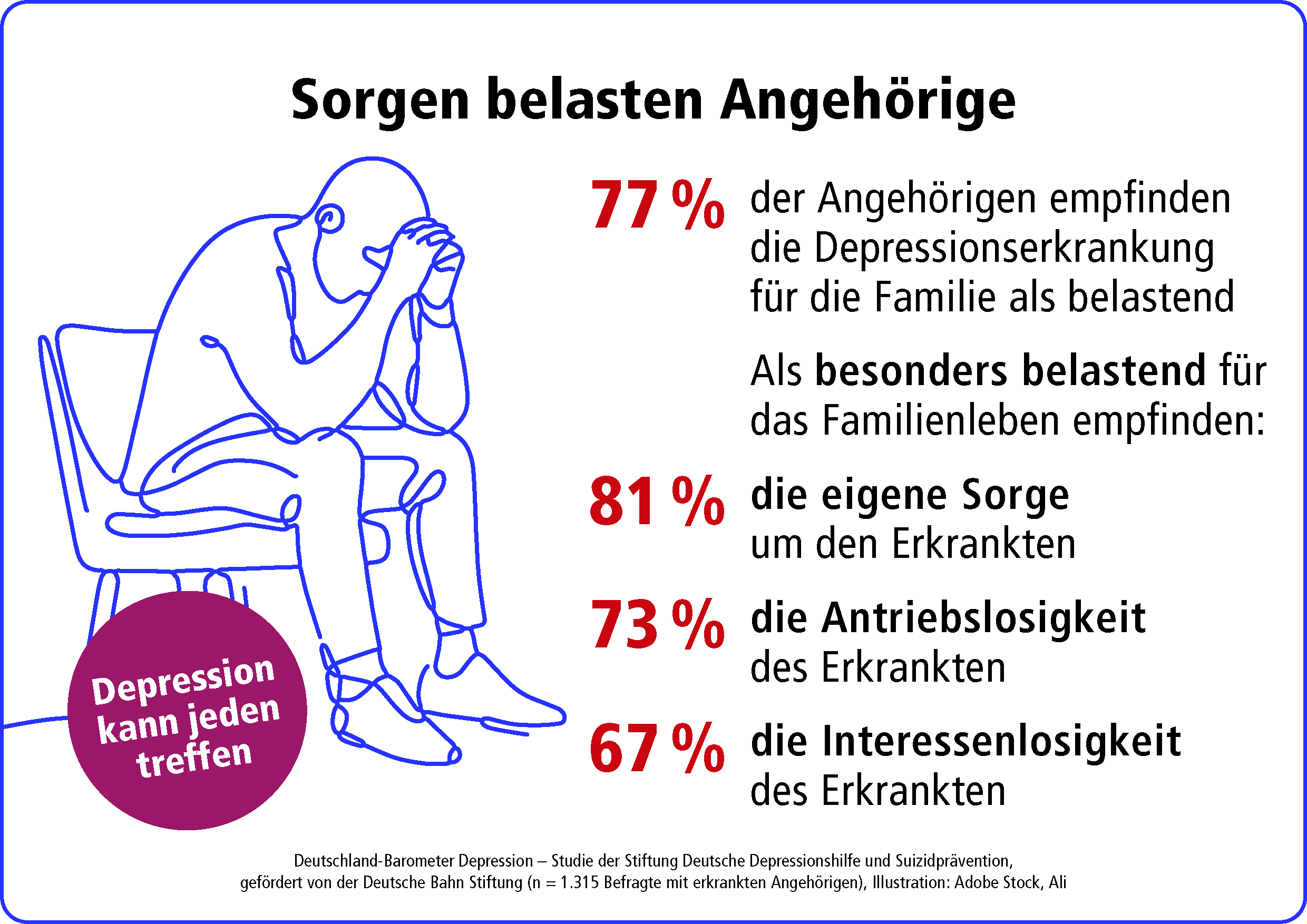 Gut drei Viertel der Angehörigen (77%) empfinden die Depressionserkrankung für das Familienleben als belastend oder sehr belastend. Vor allem die Sorge um den Erkrankten (81%) und dessen Antriebs- (73%) und Interessenslosigkeit (67%) wurden für die Familie als belastend erlebt. In 43 Prozent der Familien gab es während der Depression häufiger Streit als sonst. In jeder fünften Familie führte das sogar zu einem Kontaktabbruch (19%). „An Depression erkrankte Menschen fühlen sich erschöpft und innerlich wie abgestorben. Sie ziehen sich oft von anderen Menschen zurück, weil ihnen alles zu viel wird. Dies kann zu Missverständnissen und Konflikten führen“, so Hegerl weiter.