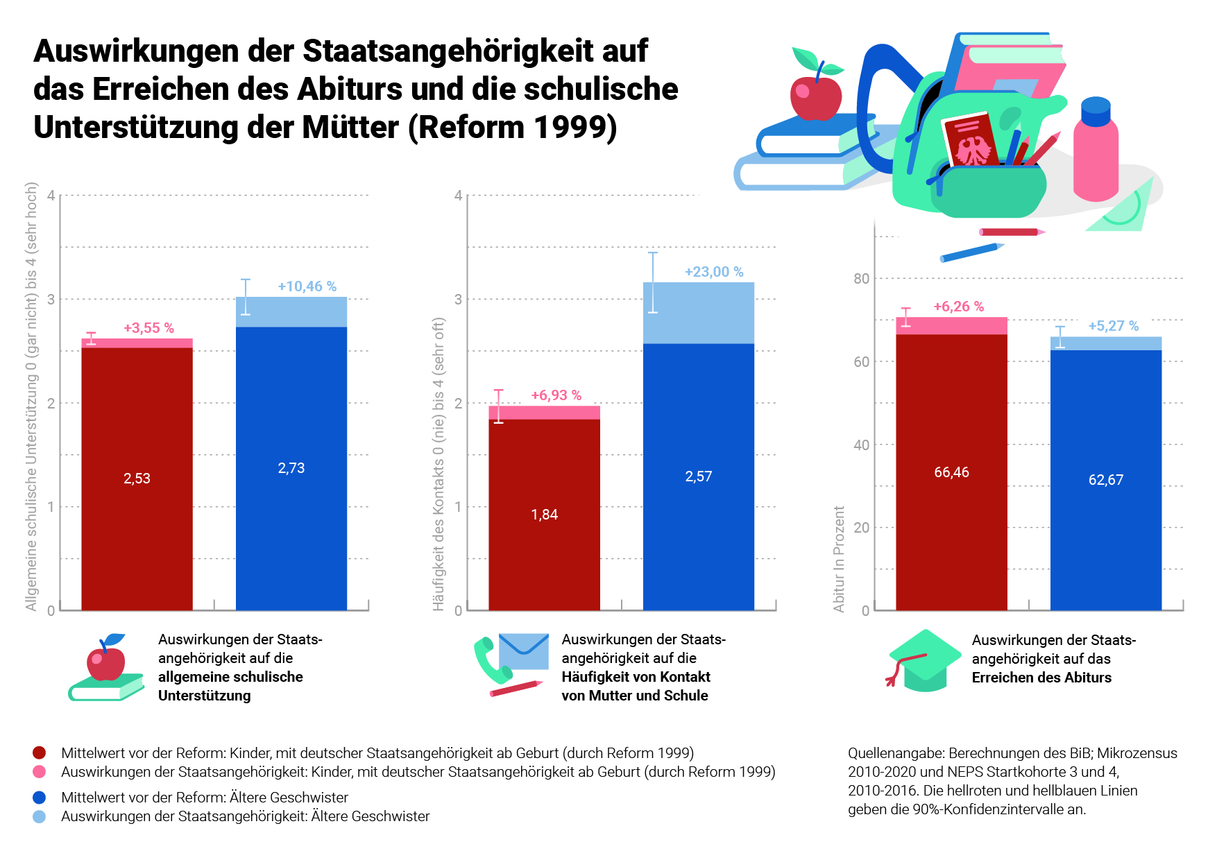 Eines der zentralen Ergebnisse der Studie: Mütter mit Zuwanderungsgeschichte, deren Kinder seit Geburt die deutsche Staatsangehörigkeit besitzen, unterstützen ihre Kinder intensiver in schulischen Belangen als Mütter mit Kindern ohne deutsche Staatsangehörigkeit. Die Studie zeigt, dass die bereits seit Geburt besessene Staatsangehörigkeit die Bildungsförderung und den langfristigen schulischen Erfolg dieser Kinder positiv beeinflusst. Zur Untersuchung dieser Effekte wird in der Studie die Reform des Staatsangehörigkeitsgesetzes von 1999 analysiert, die unter bestimmten Voraussetzungen die Staatsangehörigkeit ab Geburt ermöglicht. In der Evaluation werden dafür unterschiedliche Gruppen verglichen: Kinder, die im Jahr vor der Reform geboren sind, mit Kindern, die im Jahr nach der Reform geboren wurden, sowie Kinder, deren Eltern nach Deutschland zugewandert sind, mit Kindern, deren Eltern beide in Deutschland geboren sind. Dies ermöglicht es den bloßen Effekt der Änderung in der Staatsangehörigkeit zu isolieren.