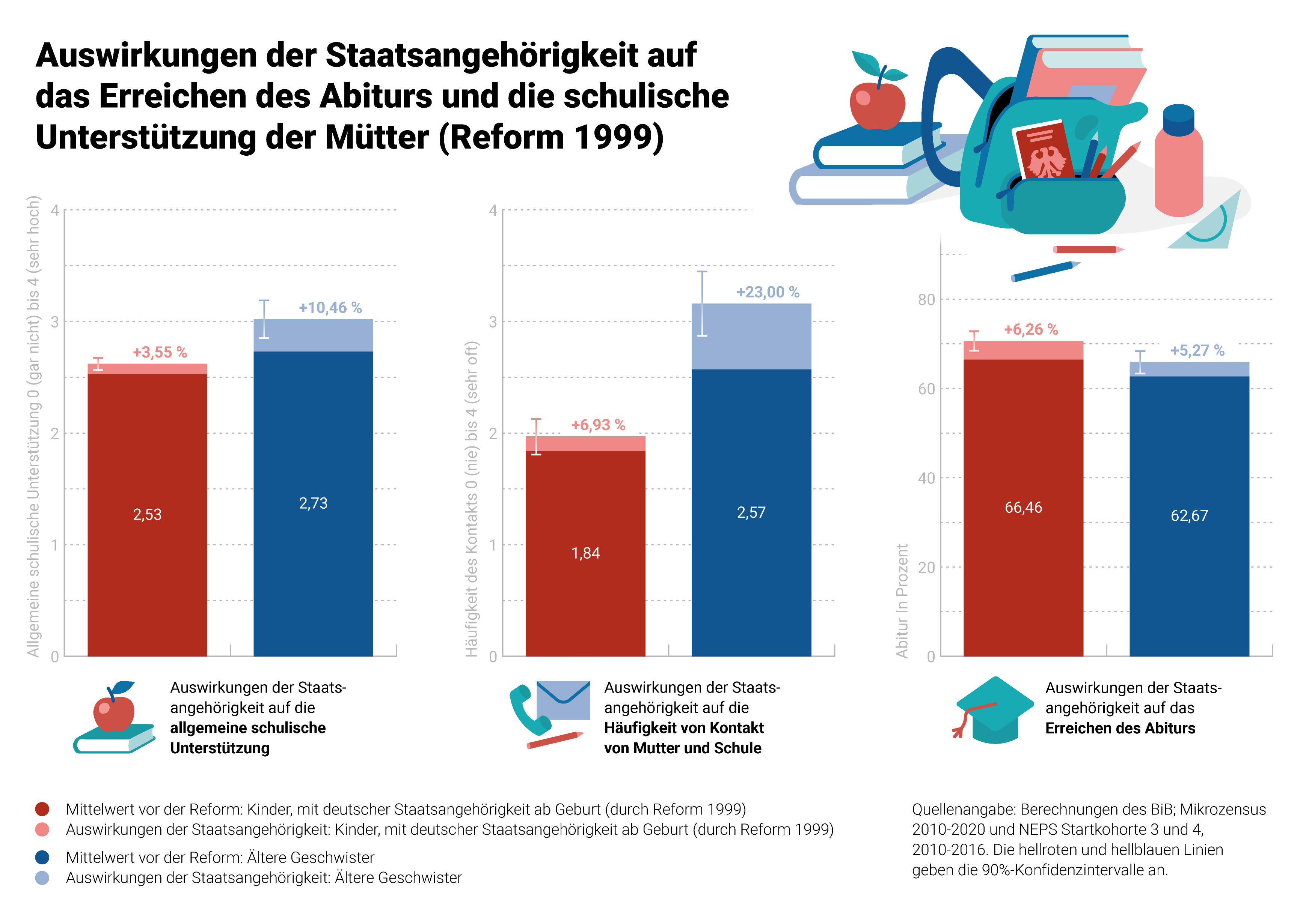 Von der Bildungsförderung von Kindern mit deutscher Staatsangehörigkeit profitieren auch ältere Geschwister unabhängig von deren eigener Staatsangehörigkeit: Denn die Mütter unterstützen nicht nur die betreffenden Kinder mehr und häufiger, sondern auch deren ältere Brüder und Schwestern. Längerfristig wirkt sich das auf die Schulabschlüsse der Kinder aus - sie machen dadurch mit einer höheren Wahrscheinlichkeit das Abitur.