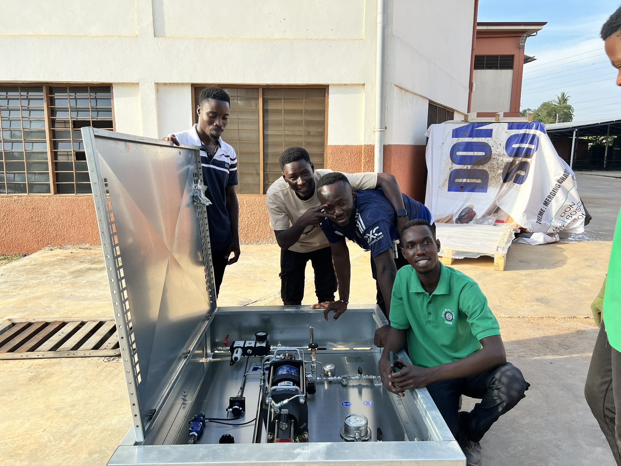 Ein weiterer wichtiger Aspekt sind die im Projekt geplanten Schulungsmaßnahmen. Die Wasserstoffanlage soll am Ausbildungsstandort genutzt werden, um Solartechniker:innen praxisnah in der Wasserstofftechnologie zu schulen und darüber hinaus eine Ausbildung für angehende Lehrer:innen anzubieten, um die Reichweite der Ausbildung zu erhöhen und somit eine Skalierung der Ausbildung in Ghana und Deutschland zu erreichen. Der Schulungsbeginn ist für das Frühjahr 2025 geplant.