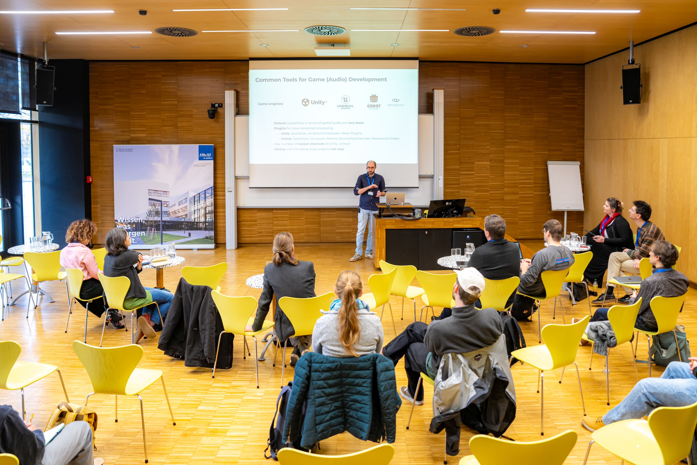 „In Anbetracht der aktuellen Entwicklungen in den Bereichen KI, Industrie 4.0, Internet of Things, AR/VR, Spiele, Cloud Computing, Big Data, mobile Anwendungen, digitales Gesundheitswesen, eMobilität und SmartCity haben sich das Design und die Funktionalität von Audioanwendungen erheblich weiterentwickelt. Es entstehen neue akustische Umgebungen in informativen, atmosphärischen und künstlerischen Kontexten“, sagt Michael Iber, Studiengangsleiter von „GRACE – Gamified Reality Applications for Real-World Challenges and Experiences*“ und Organisator von All Around Audio.