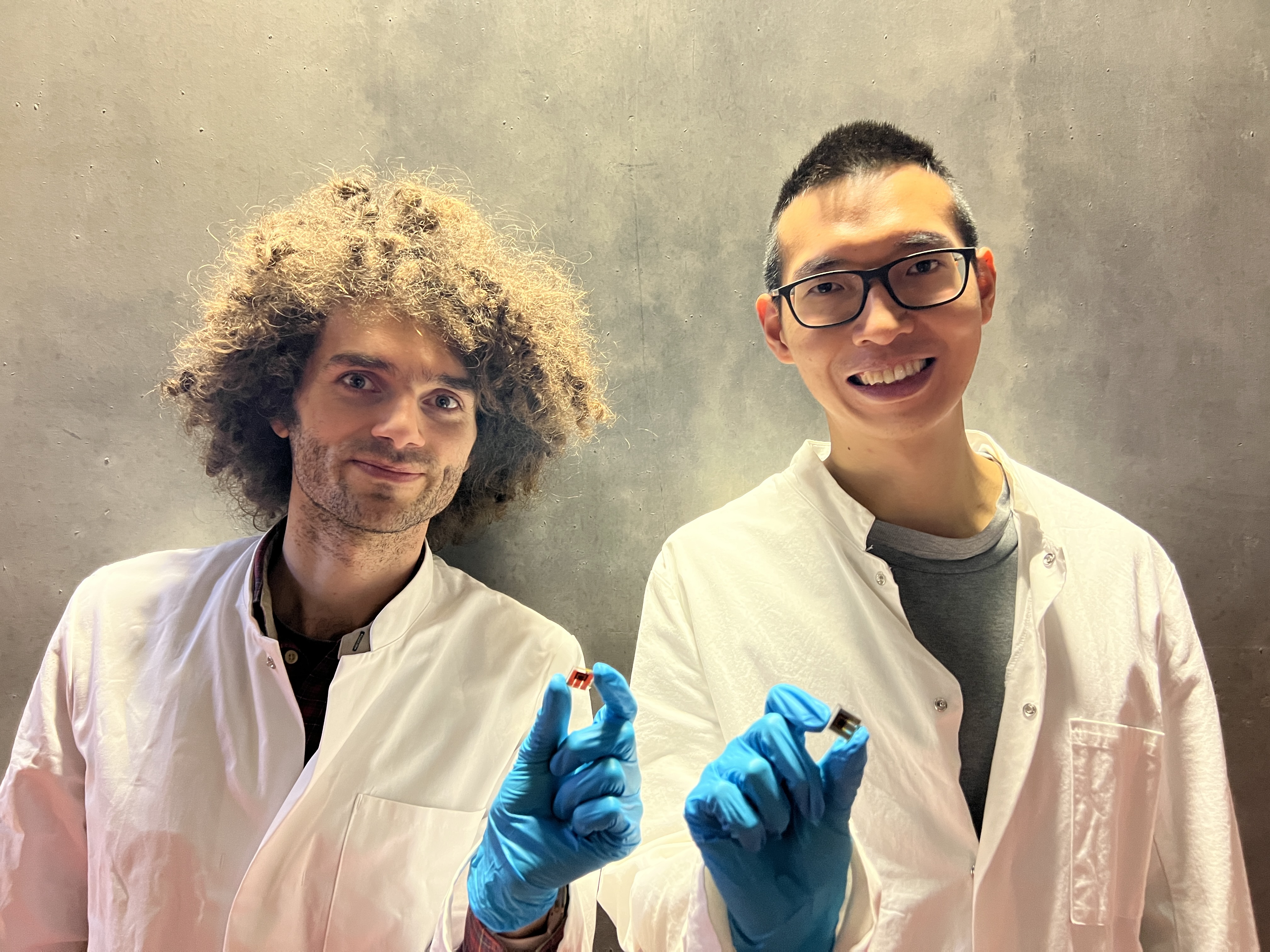 Felix Lang und Guorui He mit Perowskit-OPV-Solarzellen. Foto: C. Thee Vanichangkul