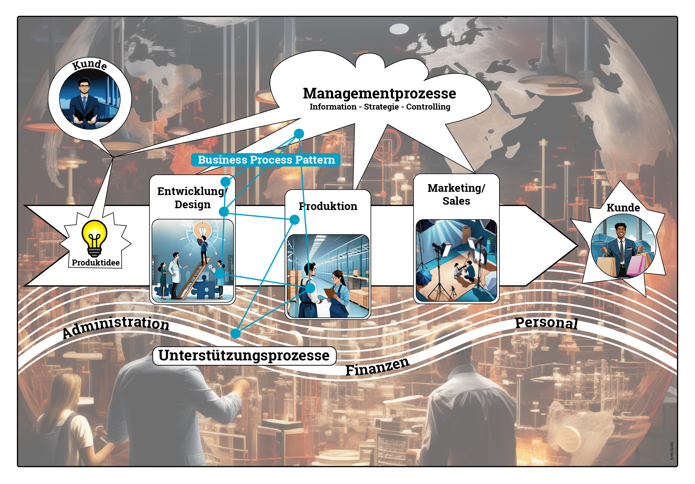 Im ersten Schritt des Projekts war es dem Team unter der Leitung von Prof. Dr. Moni-ka Blattmeier vom Fachbereich Technik gelungen, in Zusammenarbeit mit sieben kleinen und mittelständischen Unternehmen aus Ostfriesland wichtige Prozesse und zugleich die Kernkompetenzen in den jeweiligen Firmen zu erfassen. An-schließend wurde auf Basis dieses Austausches ein so genannter Pattern-Pool von Teammitglied und Grafikdesignerin Lisa Wolters mit Pattern-Visualisierungen befüllt. Dahinter verbergen sich Schaubilder, die sowohl Abläufe als auch Werte des Un-ternehmens und seiner Mitarbeitenden veranschaulichen. Diese Illustrationen bil-den die Grundlage für die Beteiligten, um sich konkret über die jeweiligen Prozesse auszutauschen und die ihnen zugrundeliegenden Systeme zu diskutieren.