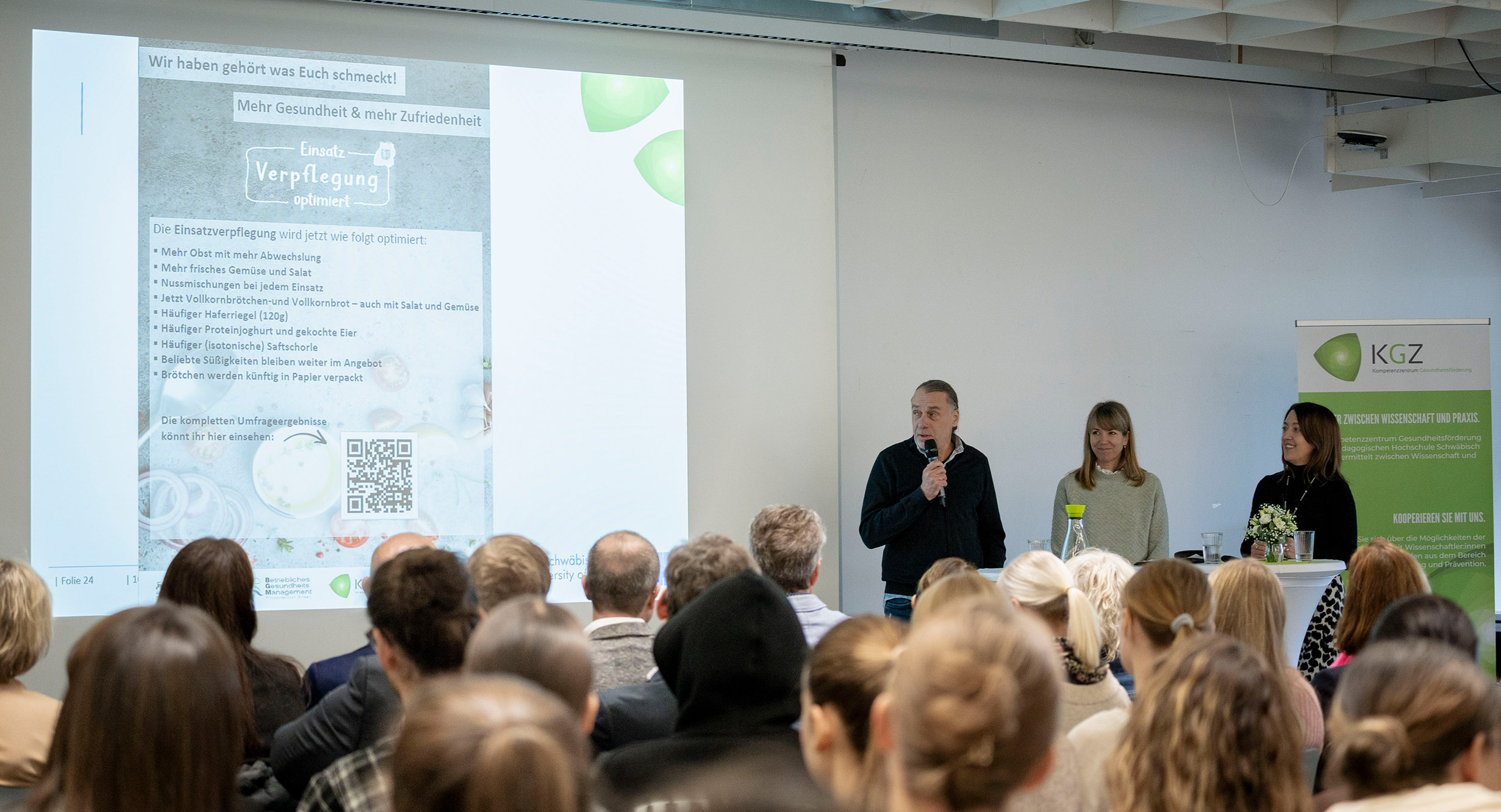 Entstanden ist eine „unwiderstehliche Mischung“, wie es Nicole Veigel vom Polizeipräsidium Aalen bezeichnete, die als langjährige Kooperationspartnerin des KGZ zusammen mit ihrem Kollegen Jochen Frech vom Polizeipräsidium Einsatz in Göppingen Projekte des Betrieblichen Gesundheitsmanagements vorstellte, die das KGZ wissenschaftlich begleitet hat. So analysierte das Kompetenzzentrum beispielsweise die Verpflegung der Einsatzpolizei und machte Vorschläge für eine Optimierung, die zur Fußballeuropameisterschaft umgesetzt wurden.