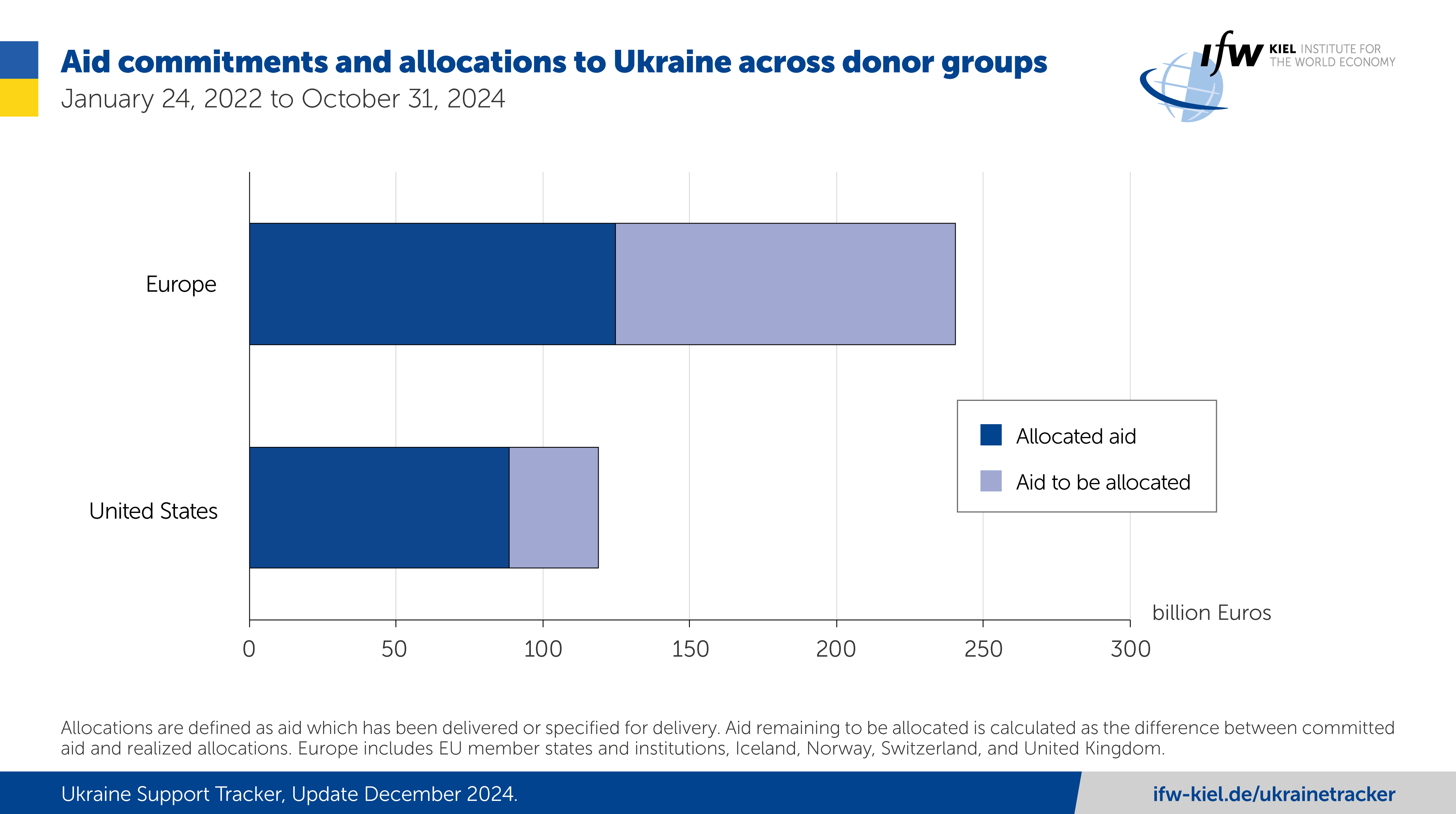 Currently, a significant gap exists on the European side between the committed €241 billion in aid and the €125 billion actually allocated. The US has already allocated €88 billion of its committed €119 billion.