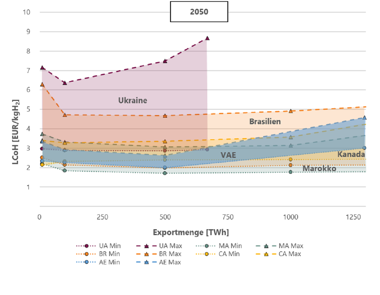 Depending on the chosen development scenario, the study considers import costs of around 3.50 to 6.50 euros per kilogram of hydrogen possible in 2030 and 2 to 4.50 euros per kilogram in 2050 (see figure). In principle, most of the countries analyzed can realize costs at a comparable level.