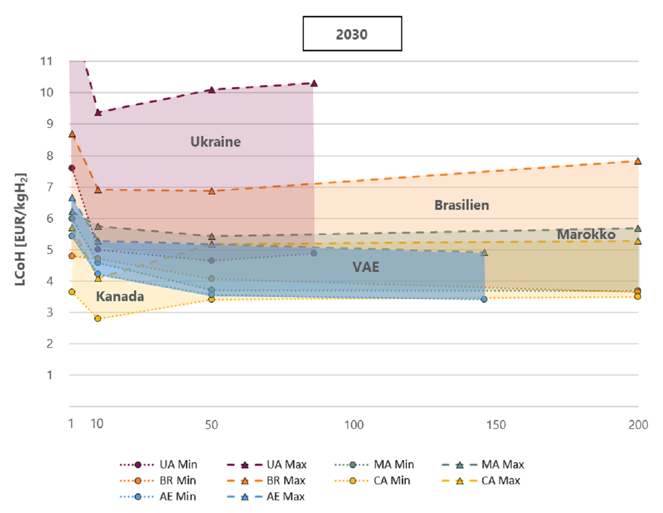In Abhängigkeit vom gewählten Entwicklungsszenario sind laut der Studie künftig Im-portkosten von ca. 3,50 bis 6,50 Euro pro Kilogramm Wasserstoff in 2030 und 2 bis 4,50 Euro in 2050 möglich (s. Abb.). Prinzipiell können die meisten der im Projekt analysierten Länder Kosten in vergleichbarer Höhe realisieren.