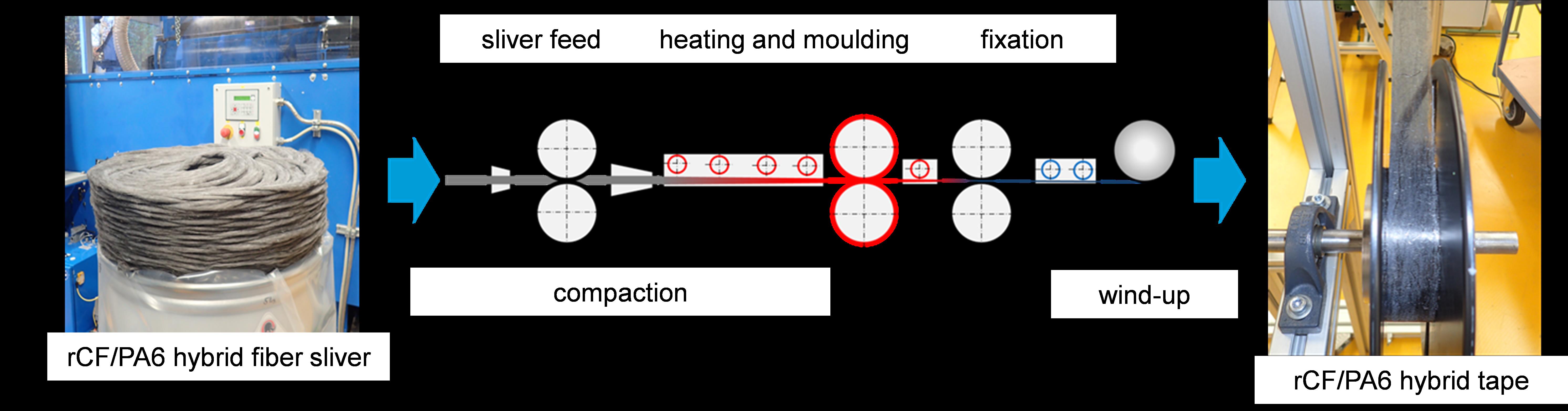 In a first step, the carbon fibers are opened and mixed with thermoplastic matrix fibers (polyamide 6). The fiber mixture is then further separated and oriented in a carding process modified for the processing of carbon fibers. At the outlet of the carding machine, the fiber card web produced in the carding process is combined into a fiber sliver and deposited in a can. This rCF/PA6 fiber sliver is the starting material for the subsequent tape forming process and already has a pre-orientation of the carbon fibers. The orientation of the fibers can be increased in the subsequent drawing process. By drawing the fiber tape, the fibers are moved in the direction of draft and aligned longitudinally. The final process step is tape formation, in which the fiber tape is under tension formed into the desired shape and then fixed into a continuous tape structure. During fixation, the thermoplastic fibers melt partially or completely and then solidify.