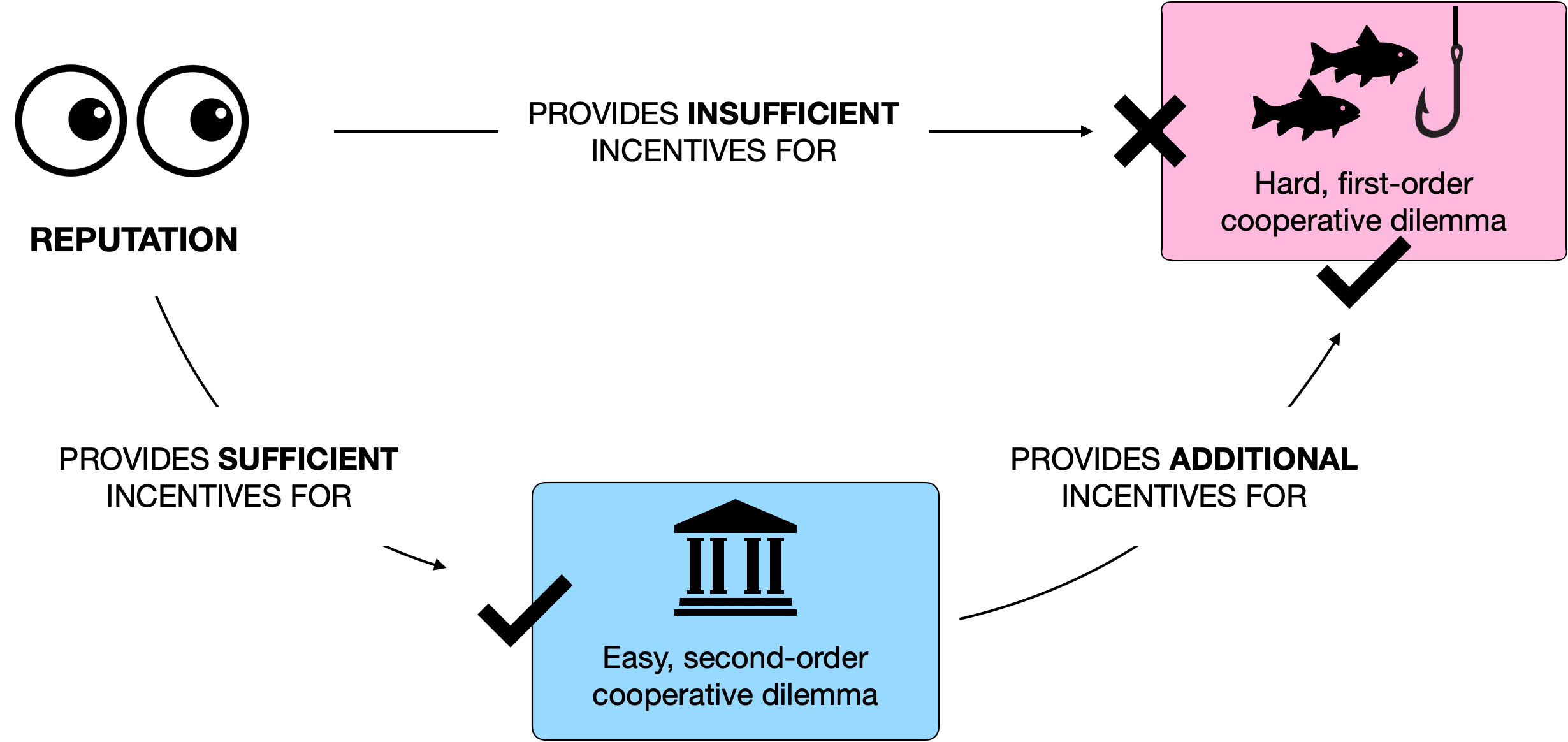 The study concludes that institutions function as social technologies that harness universal human motives, such as the desire for a good reputation. Just as a pulley amplifies a small force to lift a heavy load, institutions transform weak reputation effects into strong incentives for cooperation. Over time, institutions may have been refined to maximise the social leverage effect, enabling societies to address increasingly complex cooperation challenges.