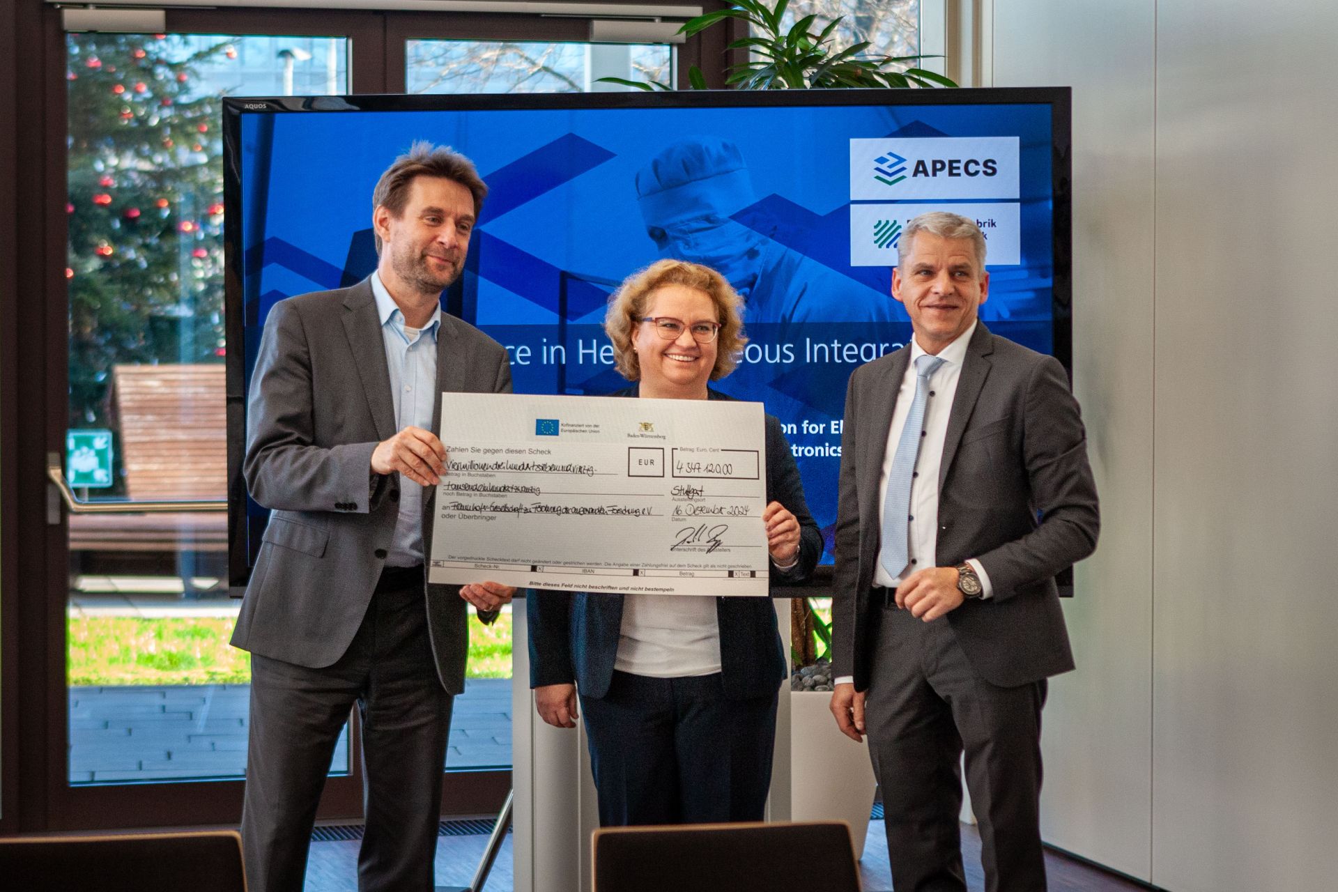 “The APECS pilot line is a project of strategic importance for Baden-Württemberg, as it is about participating in highly innovative developments in the field of semiconductor technologies and supporting a rapid transfer to our companies. Only in this way can we as a state continue to demonstrate our role as a leading innovation region in Europe,” said Dr. Patrick Rapp, State Secretary in the Ministry of Economic Affairs, Labour and Tourism, at the handover of the symbolic funding cheque.