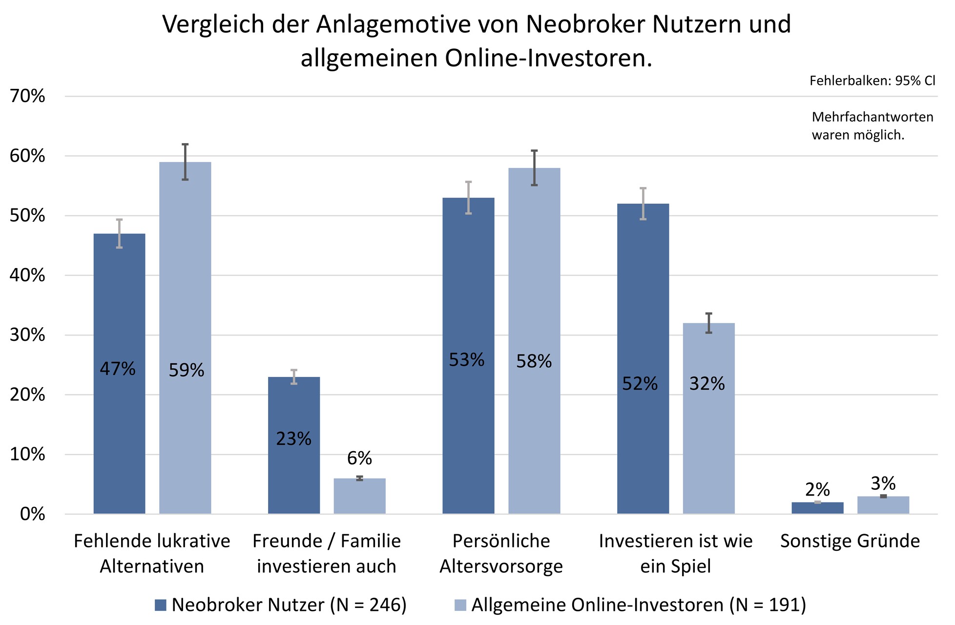 Die Studie zeigt, dass Neobroker Nutzende im Vergleich zu traditionellen Investorinnen und Investoren jünger und risikofreudiger sind und auch insgesamt mehr handeln. Letzteres wirke sich vor allem bei Privatanlegenden langfristig negativ auf die Rendite aus. Bemerkenswert ist außerdem, dass der Wissens- und Erfahrungsstand der Neobroker Nutzenden zwar im Laufe der Zeit zunimmt, jedoch trotzdem auf einem niedrigen Niveau bleibt. So gaben nur sieben Prozent der Neobroker Nutzenden an, zu wissen, wie das Geschäftsmodel von Trading Apps funktioniert.