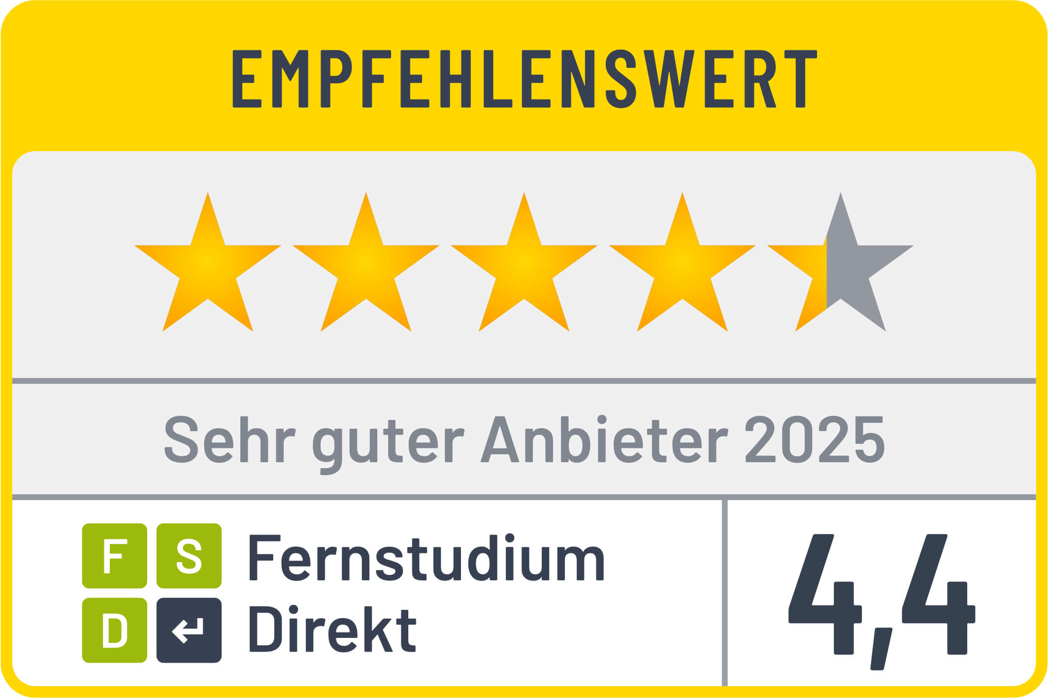 Im Jahr 2024 bewerteten Fernstudierende wieder ihre Studiengänge und Kurse in den Kategorien „Unterricht & Konzept“, „Inhalt & Materialien“ sowie „Betreuung & Organisation“. Das Vergleichsportal Fernstudium Direkt erstellt auf dieser Grundlage jährlich ein Ranking der besten Fernstudienanbieter. Pro Kategorie konnten die Studierenden zwischen einem und fünf Sternen vergeben. Das zfh erhielt eine Gesamtbewertung von 4,4 Sternen und somit das Siegel "Sehr guter Anbieter 2025".