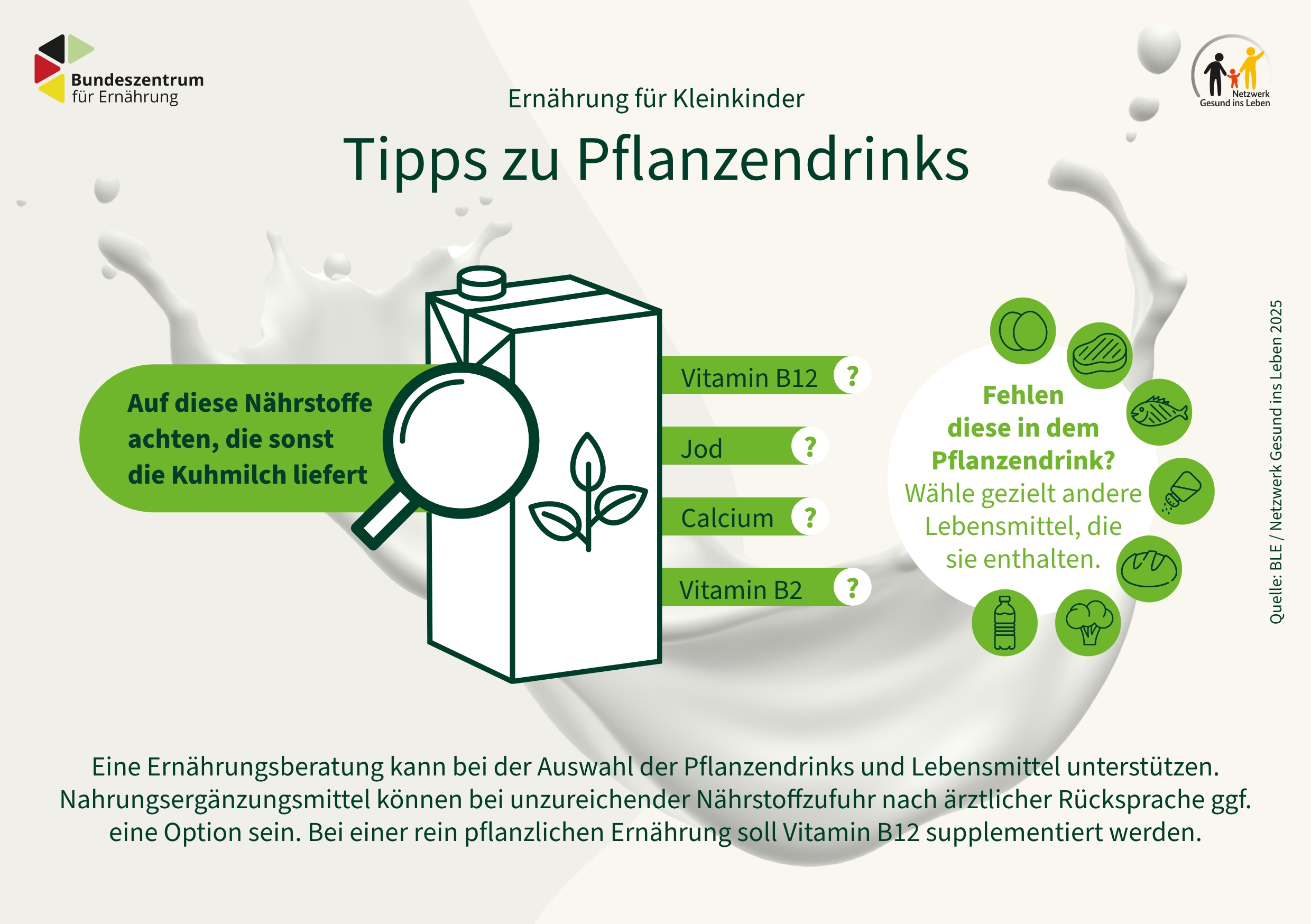 Ausführlichere Informationen zum Thema bietet der neue Nachgefragt-Beitrag „Pflanzendrinks statt Kuhmilch: Wie ist der Ersatz in der Ernährung von Kleinkindern zu bewerten?“ https://www.gesund-ins-leben.de/fuer-fachkreise/ernaehrung-und-bewegung-fuer-kleinkinder/nachgefragt/pflanzendrinks-statt-kuhmilch-bewertung des Netzwerks Gesund ins Leben. Neben praxisnahen Empfehlungen beinhaltet er wissenschaftliche Berechnungen zur Bedeutung von Kuhmilch in der Ernährung von Kindern zwischen einem und drei Jahren.