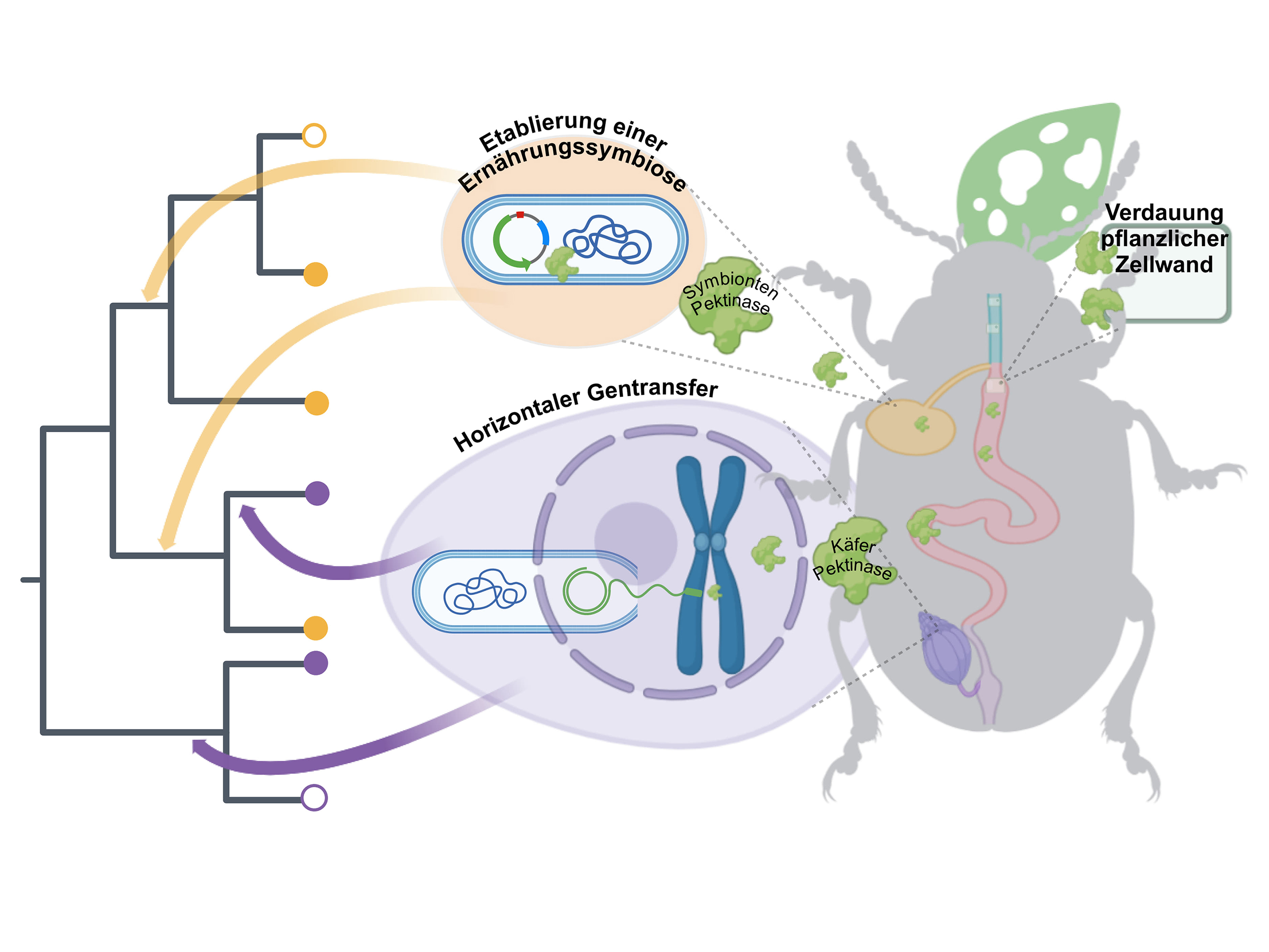 Ein Forschungsteam des Max-Planck-Instituts für chemische Ökologie in Jena und des Max-Planck-Instituts für Biologie in Tübingen hat den evolutionären Erfolg von Blattkäfern, eine der artenreichsten Gruppen pflanzenfressender Tiere auf der Erde, untersucht. Die Forschenden zeigten, dass sich Symbiosen mit Bakterien in verschiedenen Unterfamilien der Blattkäfer wiederholt und unabhängig voneinander entwickelt haben und wesentlich zur effizienten Verdauung von pflanzlicher Nahrung beitragen. Diese symbiotischen Beziehungen geben zudem Aufschluss darüber, wie genetisches Material zwischen Bakterien und Käfern ausgetauscht wurde. Die Studie unterstreicht die Rolle des horizontalen Gentransfers, also der Aufnahme von fremdem, bakteriellem Erbgut in das Käfergenom, die vermutlich auf frühere Symbiosen zurückgeht. Insgesamt verdeutlicht die Studie die Bedeutung mikrobieller Partnerschaften und des genetischen Austauschs für die Anpassung der Blattkäfer an eine ansonsten nur schwer verdauliche Nahrung, die ihren evolutionären Erfolg begünstigt hat.