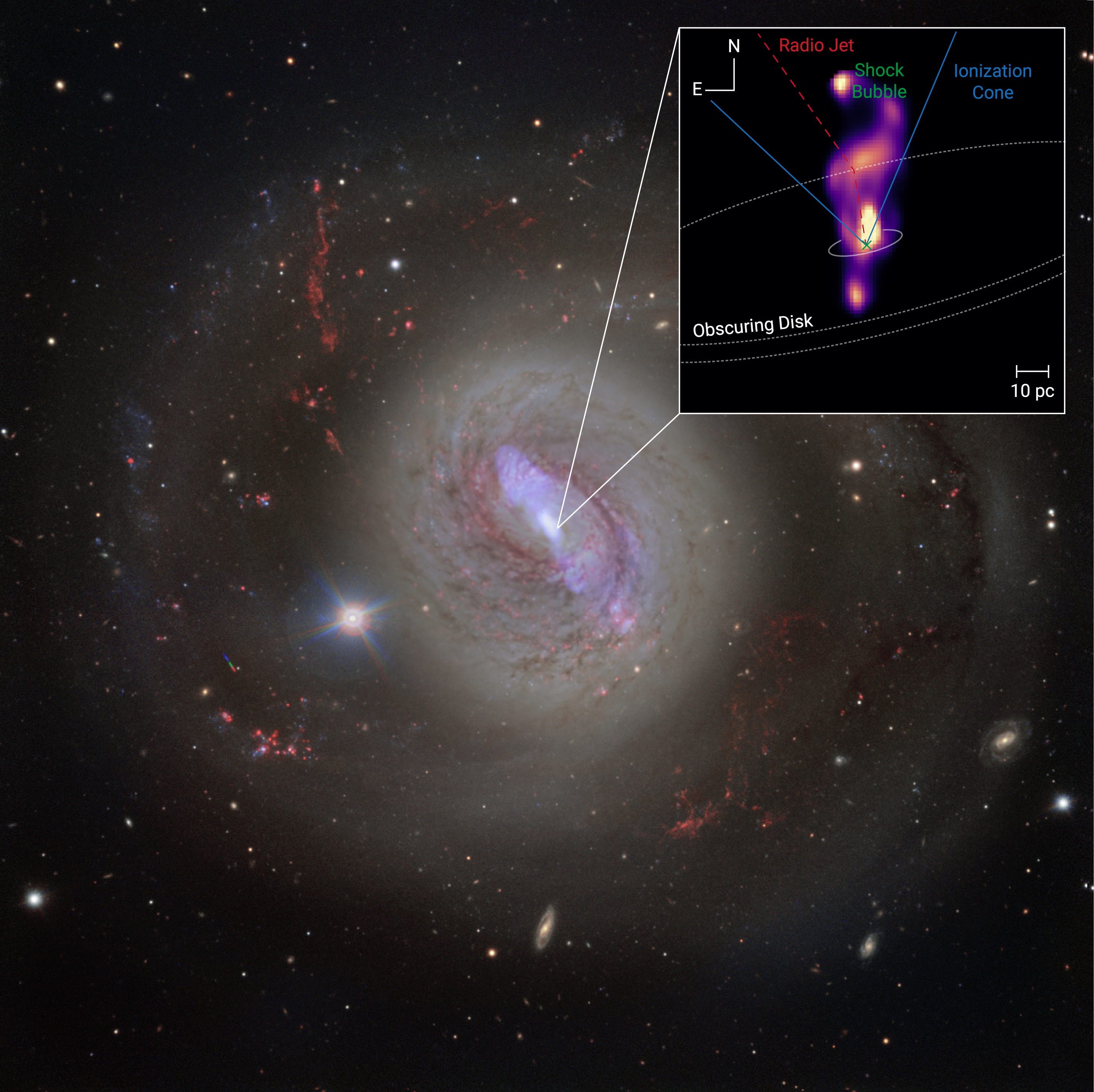 Gleichzeitig befinden sich weiter außen größere Mengen von Material, das viel heller ist, als es bei alleiniger Beleuchtung durch die helle Akkretionsscheibe hätte sein dürfen. Durch den Vergleich der neuen Bilder mit früheren Beobachtungen bei verschiedenen Wellenlängen brachten die Forscher diese Entdeckung mit einem gebündelten Strom heißen Gases in Verbindung, der vom Zentrum der Scheibe ausgeht. Während er durch die Galaxie schießt, trifft er auf Wolken aus molekularem Gas und Staub und erhitzt diese, was zu dem unerwartet hellen Infrarotsignal führt. Solche sogenannten Jets sind bei Radiowellenlängen besonders hell, wenn sie auf Gas und Partikel in der Umgebung der supermassereichen Schwarzen Löcher treffen.