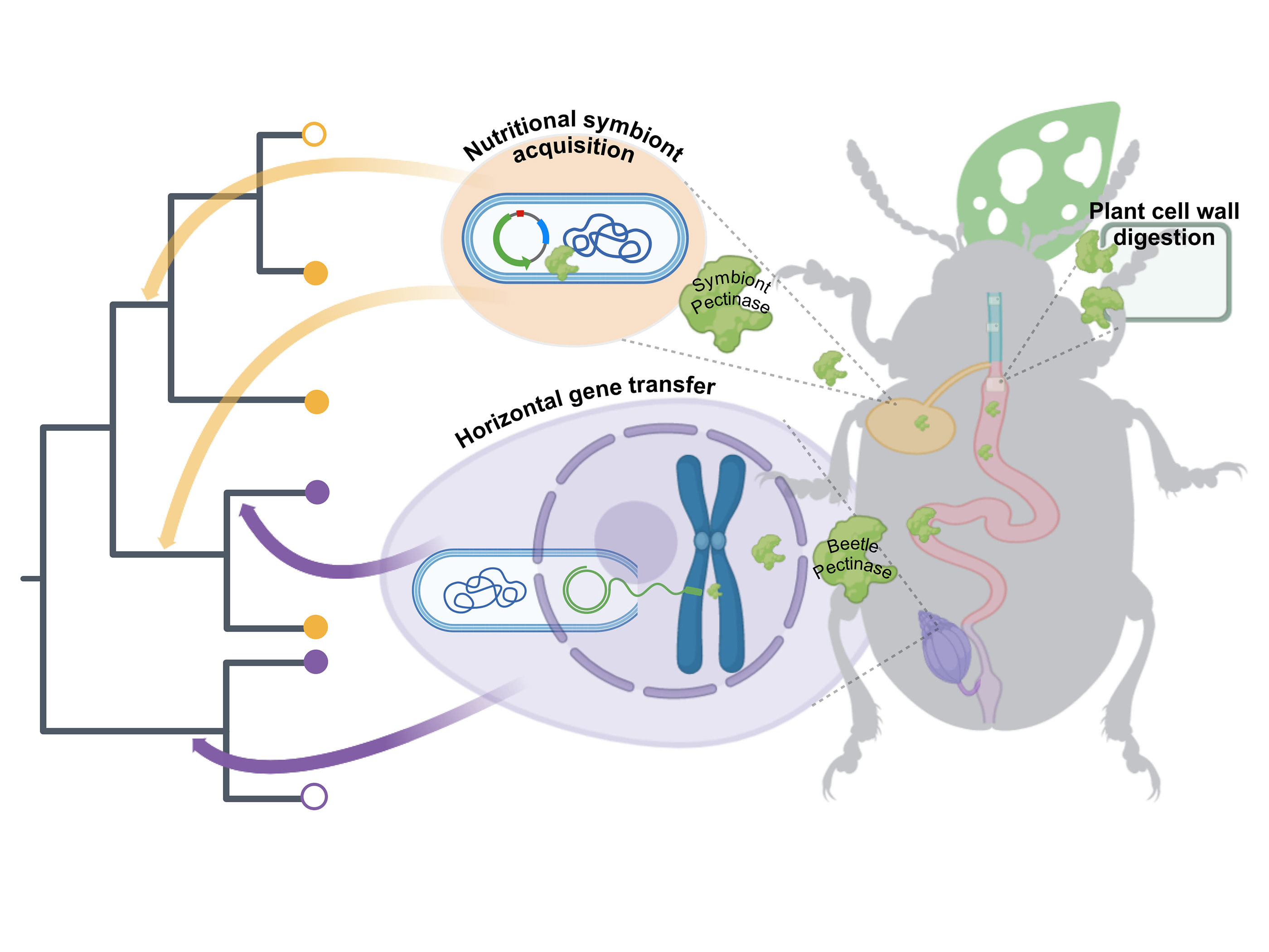 The analyses also revealed that the vast majority of the beetle species use either their own pectinases, acquired through horizontal gene transfer, or the pectinases of their bacterial symbionts. However, beetle and symbiont pectinases never occurred together in any beetle species.