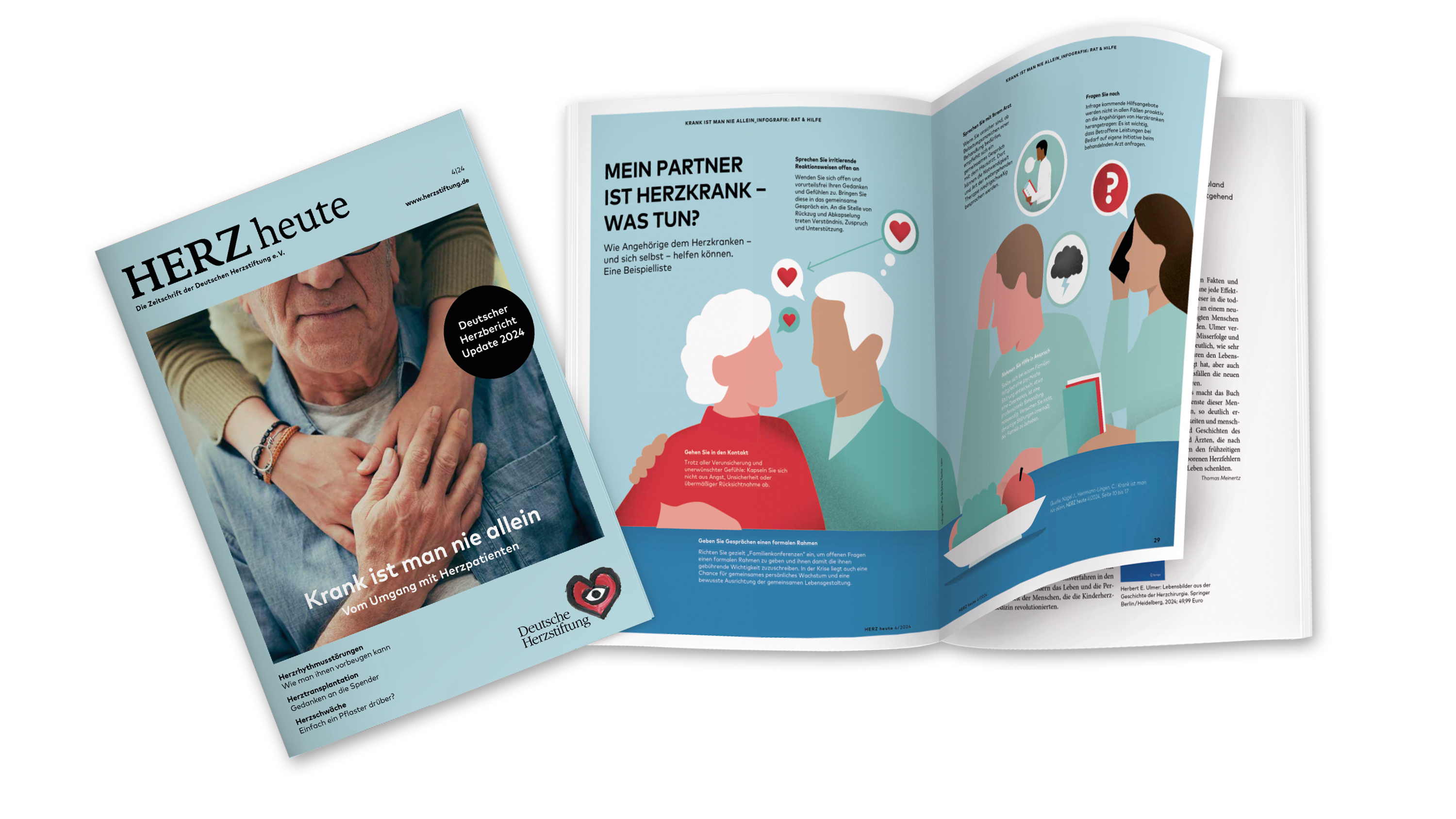 Mehr Informationen rund um das Thema Spenderperson- und Organgedanken vor und nach einer Herztransplantation mit hilfreichen Hinweisen für Betroffenen bietet die Herzstiftung in der Ausgabe 4/2024 ihrer Zeitschrift HERZ heute mit dem Titel „Krank ist man nie allen – Vom Umgang mit Herzpatienten“. Ein Probe-Exemplar dieser Ausgabe kann kostenfrei unter Tel. 069 955128-400 oder unter https://herzstiftung.de/bestellung angefordert werden.