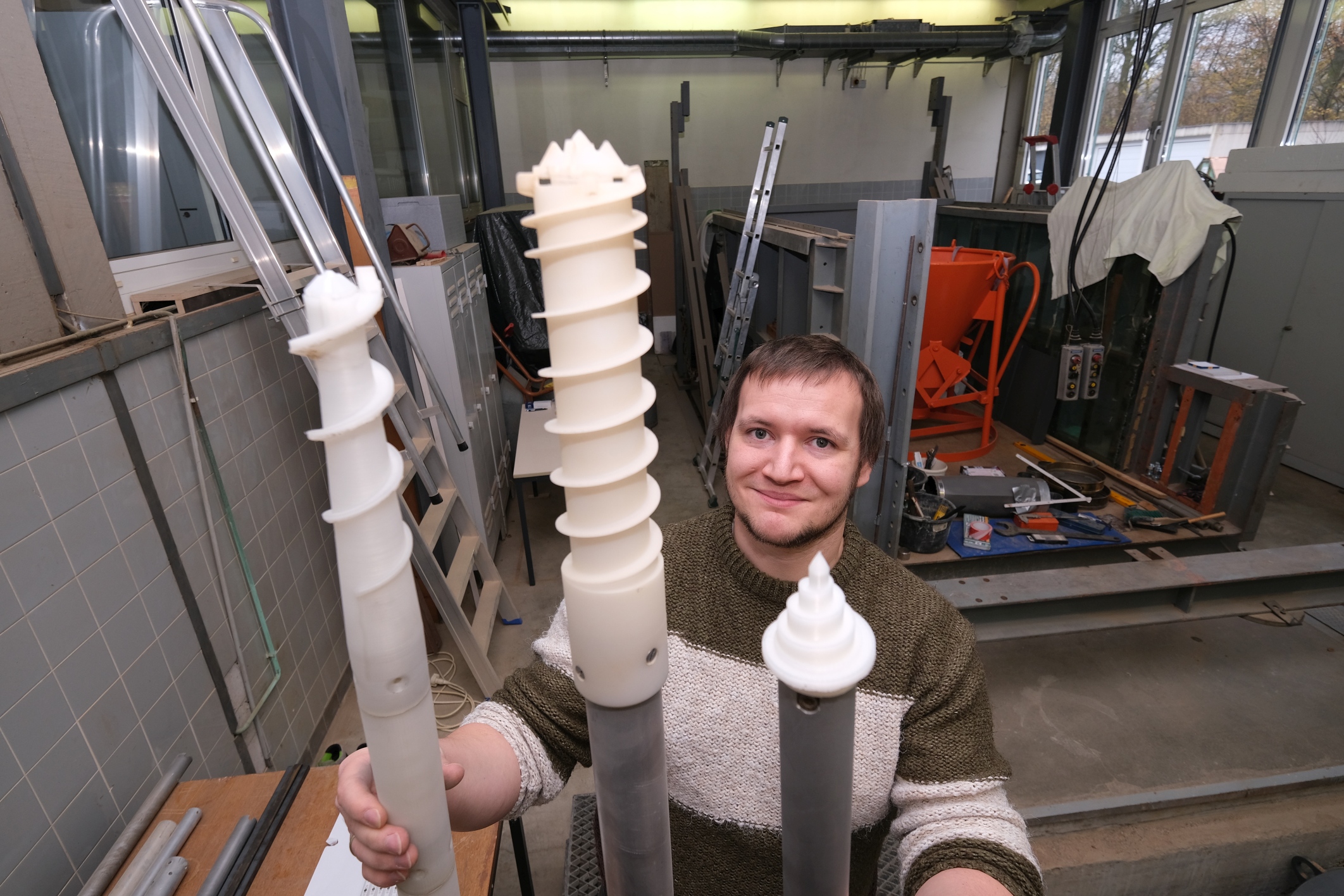 „Wie auf der Baustelle drehen wir die unterschiedlichen Bohrwerkzeuge in unseren Versuchstank ein. Anschließend prüfen wir die Tragfähigkeit der jeweils entstandenen Pfähle. Dazu bringen wir über einen Hydraulikzylinder am Pfahlkopf eine Last auf, die wir stufenweise steigern“, erklärt Projektmitarbeiter Johannes Kuhlmann vom Lehrstuhl für Geotechnik. Ein ausgeklügeltes Messkonzept registriert, welche Lasten die Pfähle tragen können und welche mechanischen Veränderungen sich jeweils im Boden ergeben.