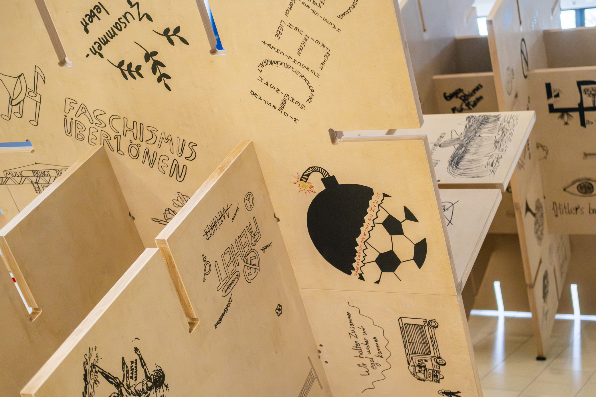 „Eigentlich ist es ja etwas sehr Positives, wenn eine künstlerische Arbeit aktuelle gesellschaftlichen Tendenzen aufnimmt“, sagte die Hochschulpräsidentin Prof. Dr. Ana Dimke zu Beginn der Feierlichkeiten. „Dennoch macht es angesichts der weltweiten politischen Lage tief besorgt, wenn Kunst gegen Faschismus heute diese Aktualität haben muss und somit zu einem der wichtigsten Themen wird, die Studierende wie Schüler*innen diskutieren sollten, um den heutigen Stand der Demokratie und die Situation in Braunschweig zu reflektieren.“ Der Part der HBK Braunschweig unter Leitung von Prof. Martin Krenn war es, im Rahmen des EU-Projekts ein Antifaschismusprojekt in Braunschweig in Zusammenarbeit mit Schulen zu realisieren. Für diesen gemeinsamen Lernprozess konnten Schüler*innen der Wilhelm-Bracke-Gesamtschule, der IGS Querum, des Gymnasiums Neue Oberschule und der Realschule Georg-Eckert-Straße begeistert werden. Studierende des Studienganges Kunstvermittlung hielten in den vier Partnerschulen jeweils zwei Workshops ab, deren Resultat, die noch einen Monat lang in der VHS Braunschweig (Alte Waage 15) zu sehende modulare Wander-Skulptur, ist. „Der Widerstand gegen den Faschismus findet in unserem Alltag statt – in unseren Worten, in unseren Taten, in unserem Zusammenleben. In diesem Sinnen steht die Skulptur für einen lebendigen Auftrag an uns alle“, so Prof. Dr. Ana Dimke.