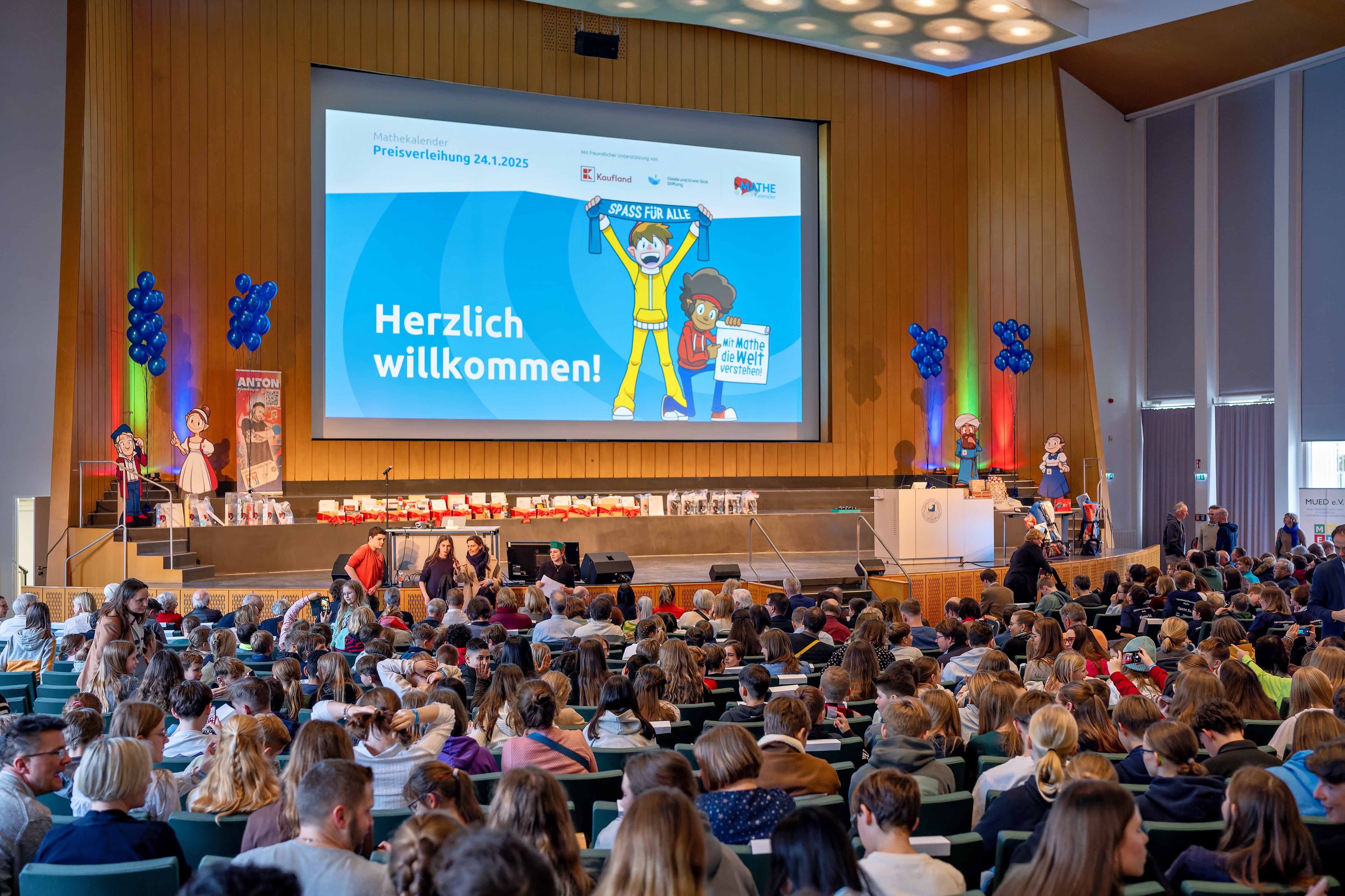 Als Kalender-Abschluss fand die große feierliche Preisverleihung mit fast 700 Gewinner*innen am 24. Januar 2025 in Berlin an der Freien Universität im Audimax statt – und es drehte sich natürlich alles um die Faszination der Mathematik: Im Mathe-Bazar konnten sich die kleinen und großen Gäste an mathematischen Spielen und interaktiven Ständen ausprobieren, bevor im Festsaal die Gewinner*innen ausgezeichnet wurden. Erstmals gab es einen „Jugend forscht“ Stand, wo Jugendliche ihre erfolgreichen Projekte vorgestellt haben. Zudem präsentierte die MUED – ein alternativer Mathelehrerverein aus NRW – mathematische Spiele, die man auch im Unterricht gut einsetzen kann und HPE faszinierte die Gäste mit dem Supercomputer. Die Teilnehmenden wurden schon beim Einlass mit einem Gratulationsfilm empfangen, in dem einige Initiatoren und Mitspielende das „20-jährige Jubiläum der Mathe-Adventskalender“ feierten und herzlich gratulierten.