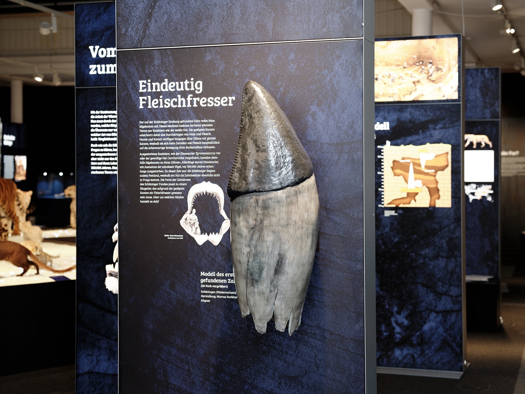 Ein Highlight-Exponat der Ausstellung zeigt gleich zu Beginn, um wen es hier geht: Eine lebensechte Rekonstruktion einer europäischen Säbelzahnkatze und ihrer zwei Jungtiere begrüßt die Besucher*innen am Eingang. Inhaltlicher Ausgangspunkt ist der Fund eines rund 300.000 Jahre alten Zahns im Jahr 2012 an der bekannten Ausgrabungsstätte im niedersächsischen Schöningen. Dieser entpuppte sich als Überrest der in Europa verbreiteten Säbelzahnkatze Homotherium latidens. Gemeinsam mit weiteren fossilen Knochenfragmenten lieferte er den ersten Beweis, dass sich die Wege von Menschen und Säbelzahnkatzen im eiszeitlichen Niedersachsen gekreuzt haben müssen. Die spannende Fundgeschichte und die wissenschaftliche Suche nach dem Tier zum gefundenen Zahn erzählt die Ausstellung anschaulich. Zu sehen sind hier Repliken der verschiedenen Schöninger Säbelzahnkatzen-Funde, die von drei Tieren stammen. Ein Modell des Zahns in 20-facher Vergrößerung lädt zur haptischen Erkundung seiner sägeartigen Kante ein.