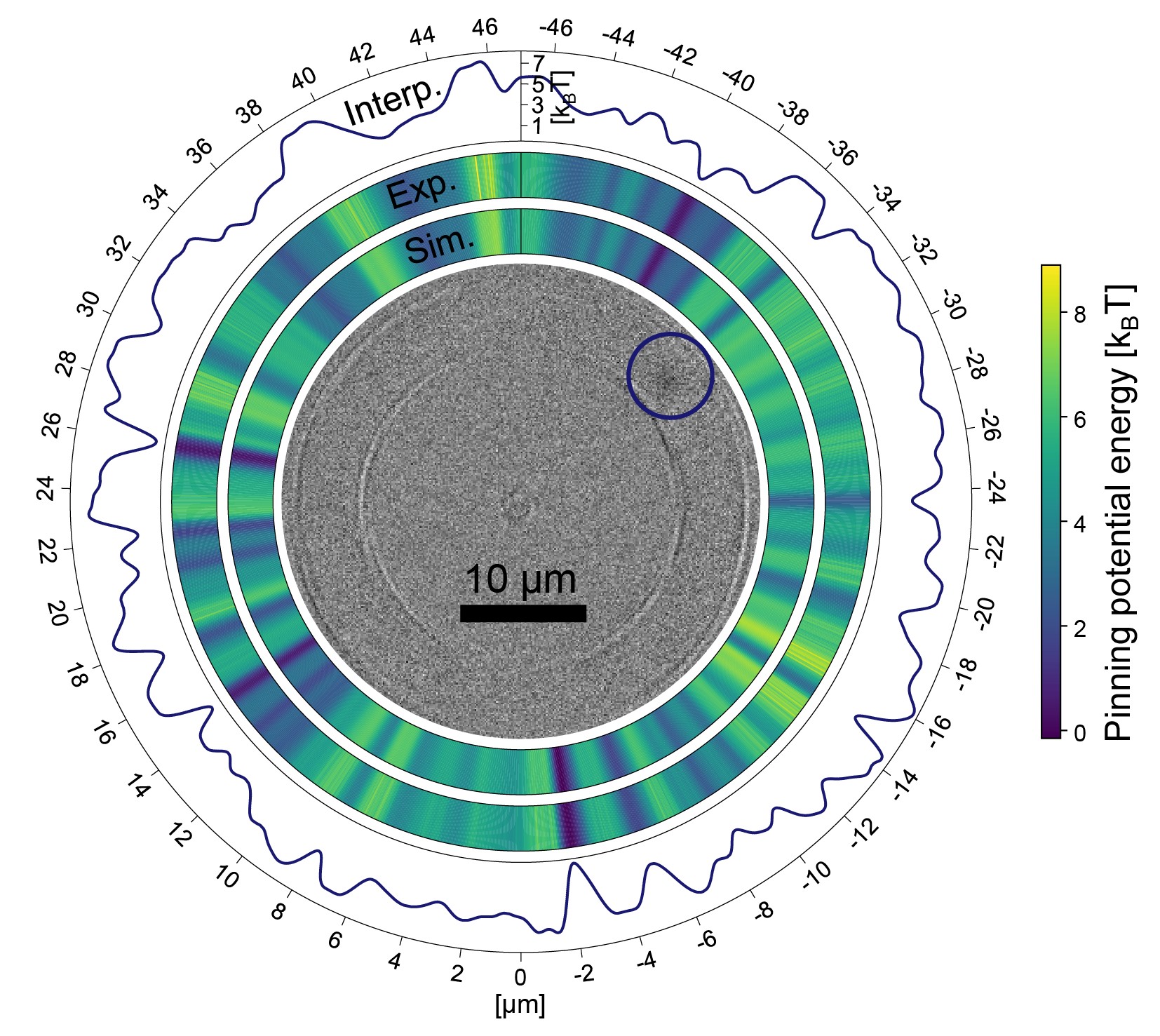 Magnetooptische Mikroskopaufnahme eines Skyrmions in einem Ring magnetischen Materials: Die wegen Materialfehlern ortsabhängige Energie wird von den Simulationen hervorragend reproduziert und ist im äußeren Graphen hochaufgelöst dargestellt.