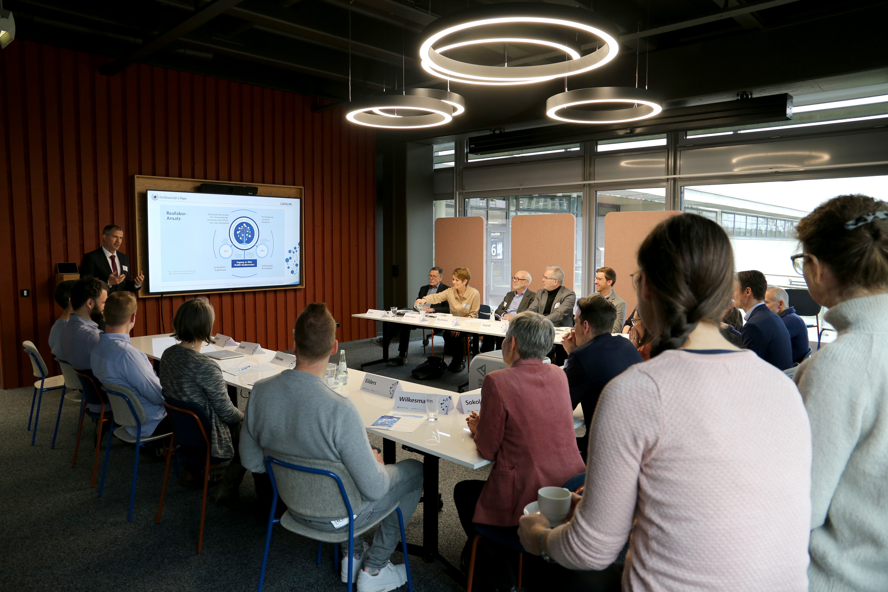 „Herzlichen Dank für die Einladung – die Zahl der Teilnehmenden zeigt reges Interesse an den Ansätzen und Erkenntnissen von CATALPA“, so Kordula Attermeyer, Referatsleiterin Digitale Gesellschaft in der NRW-Staatskanzlei bei dem Ortstermin. „Das stärkt den institutionsübergreifenden Austausch, der auch NRW-Ansatz bei der Taskforce ,KI im Bildungswesen‘ war.“