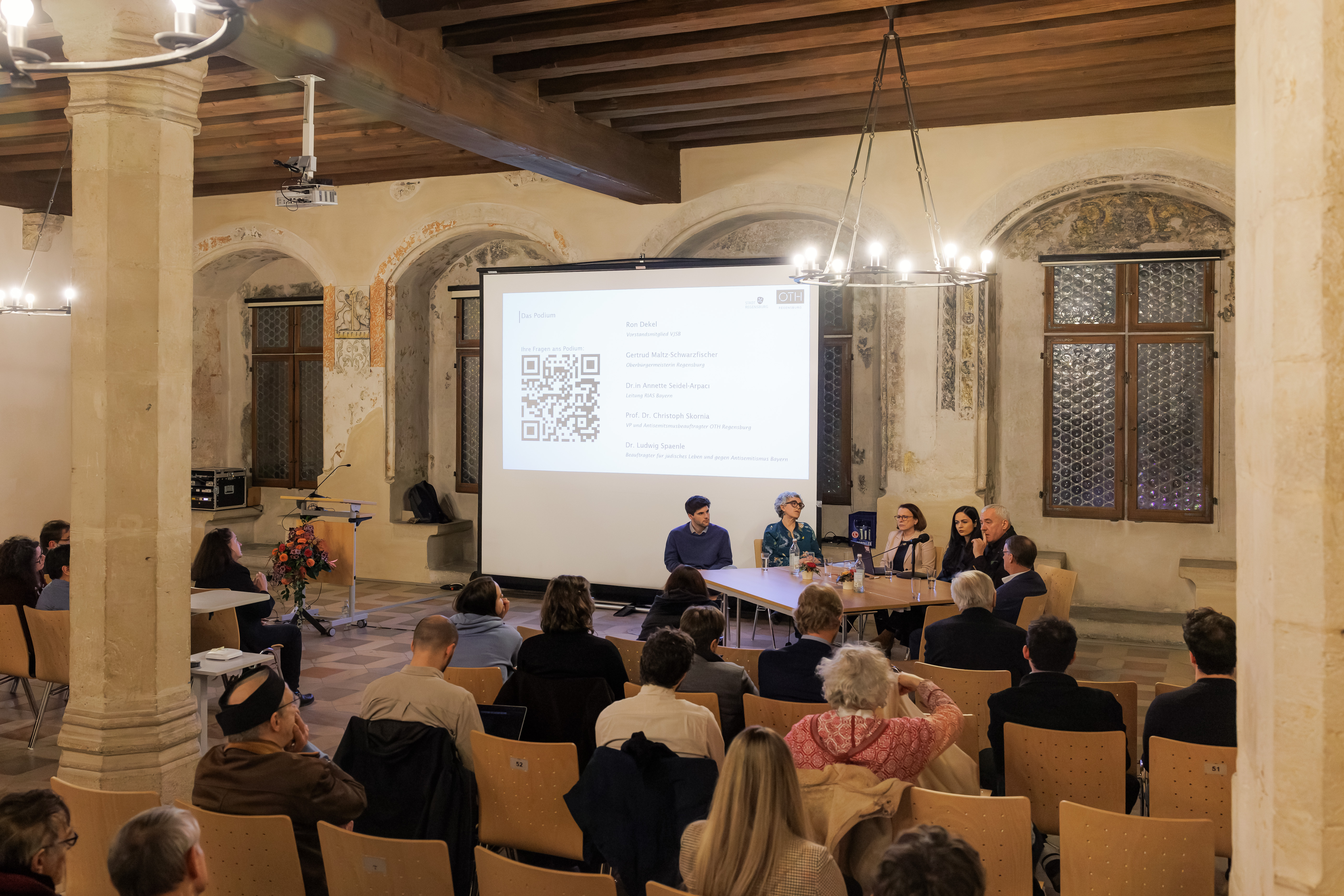 Die Oberbürgermeisterin Gertrud Maltz-Schwarzfischer und der Präsident der OTH Regensburg, Prof. Dr. Ralph Schneider, begrüßten die Zuhörenden im Herzen der Stadt. „Angesichts der beunruhigenden Entwicklungen weltweit und auch in unserem eigenen gesellschaftlichen Umfeld, insbesondere seit den Angriffen der Terrororganisation Hamas auf Israel am 7. Oktober 2023, zeigt sich, wie dringend notwendig eine tiefgehende und umfassende Auseinandersetzung mit Antisemitismus in all seinen Ausprägungen ist“, betonte Prof. Dr. Ralph Schneider.