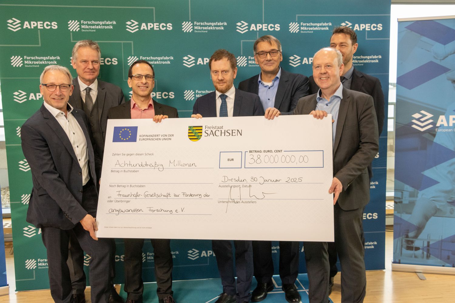 Die sächsischen Mikroelektronik-Institute der Fraunhofer-Gesellschaft erweitern ihre technologischen Kapazitäten im Bereich der Chiplet-Innovation und tragen maßgeblich zur APECS-Pilotlinie im Rahmen des European Chips Act bei. Das Land Sachsen investiert dazu 38 Millionen Euro in die Förderung. Am 30. Januar übergab Ministerpräsident Michael Kretschmer einen symbolischen Scheck über die Fördersumme. APECS ermöglicht es, in den kommenden 4,5 Jahren europaweit die Forschungs- und Entwicklungsinfrastruktur weiter auszubauen.