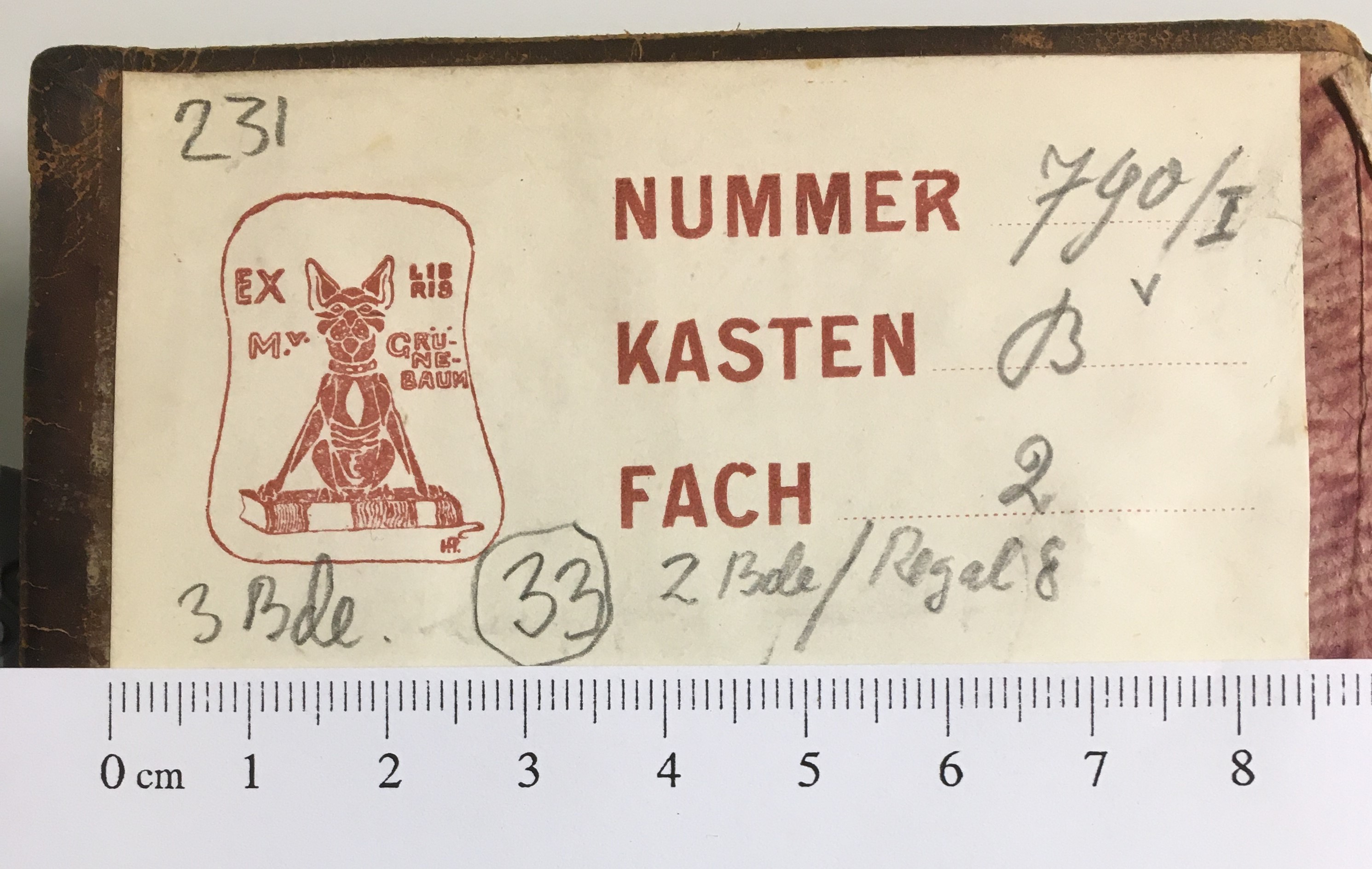Die Provenienz der Bände aus dem Eigentum von Moriz Grünebaum wurde im Rahmen des vom Deutschen Zentrum Kulturgutverluste geförderten Projekts „NS-Raubgut unter den Zugängen der Herzog August Bibliothek 1933–1969“ recherchiert. Ihr NS-verfolgungsbedingter Entzug kann als gesichert gelten, weshalb die HAB die Bücher nun an die Erbberechtigten des Sammlers restituiert hat.