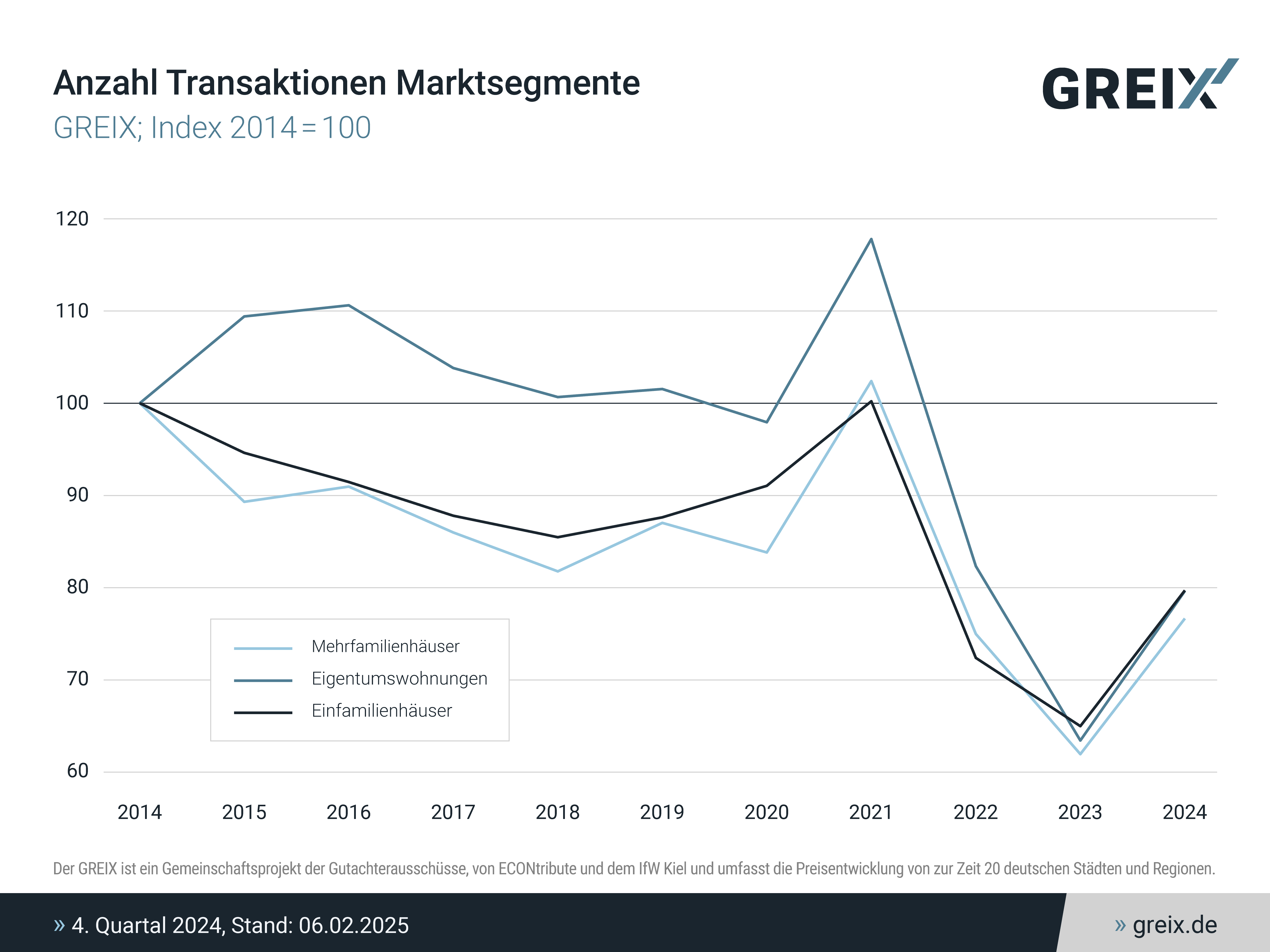Die Preiserholung für Wohnimmobilien verliert zum Jahresende 2024 an Schwung. Bei Eigentumswohnungen stagnieren die Preise, Ein- und Mehrfamilienhäuser werden etwas teurer gehandelt im Vergleich zum Vorquartal (Q3 2024). Die Marktdynamik nimmt zu, sichtbar an einer zunehmenden Anzahl von Transaktionen. Das zeigt das jüngste Update des German Real Estate Index (GREIX), ein Gemeinschaftsprojekt der Gutachterausschüsse für Grundstückswerte, ECONtribute und dem IfW Kiel. Dabei werden die Kaufpreissammlungen der Gutachterausschüsse, die notariell beglaubigte Verkaufspreise enthalten, nach wissenschaftlichen Standards auswertet. (...)