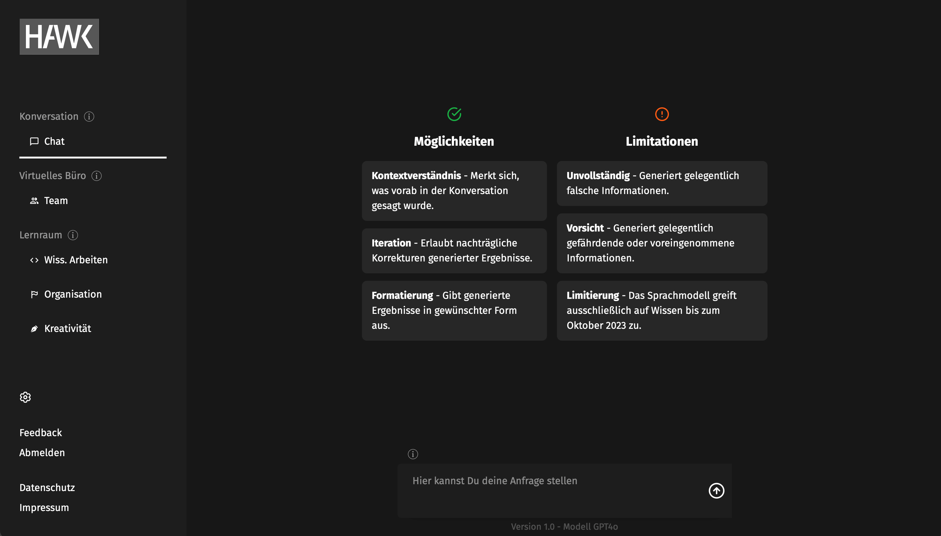 Eine Besonderheit des HAWKI-Interfaces sind die virtuellen Lernräume und Assistenten, zwischen denen die Nutzenden wählen können. Die Lernräume bieten eine Hilfestellung bei der Auseinandersetzung mit unterschiedlichen Themen und schlagen dafür auch passende Prompts vor. Prompts sind Fragen oder Anweisungen, die Nutzende dem KI-Modell geben, um eine gewünschte Antwort zu erhalten. Das präzise Formulieren von Prompts ist bei der Interaktion mit KI eine sehr wichtige Kompetenz.