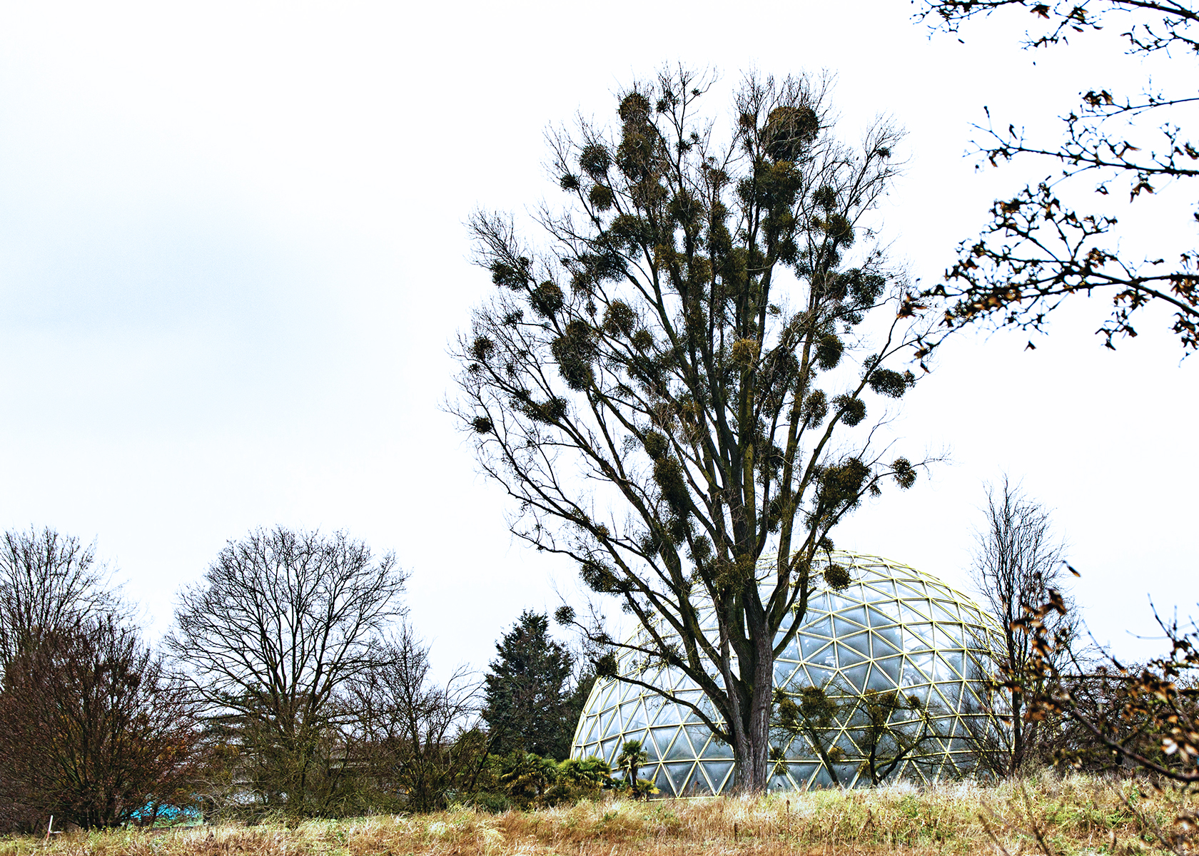 Der Winter hat auch sein Gutes: Manches wird erst richtig sichtbar, wenn die Blätter gefallen sind. So präsentieren sich die üppigen Misteln (Viscum album) an der großen Pappel (Populus) südlich des Kuppelgewächshauses. „Die Misteln sind zwar beeindruckend, doch leider schwächen sie auch ihre Wirtsbäume“, so Dr. Sabine Etges, wissenschaftliche Leiterin des Botanischen Gartens der HHU. Sie ergänzt: „Unsere Pappel hat für einen solchen Baum schon ein stattliches Alter, sie werden – etwa im Vergleich zu Eichen – in der Regel nicht so alt.“