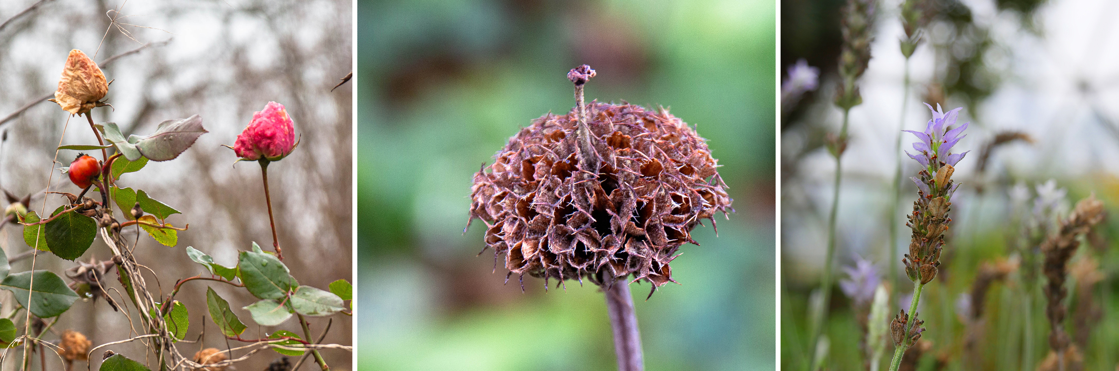 Überhaupt die Vergänglichkeit. Manchen Blüten halten sich noch bis in den Winter, so wie die der Rosen (Rosa), von denen noch einige neben ihren Hagebuttenfrüchten zu finden sind. Doch auch die vertrockneten Blüten können einen Blick wert sein, wie die kugeligen Blütenstände des Russel-Brandkrauts (Phlomis russeliana). Deutlich zu erkennen sind die pergamentartigen Kelche, die von den einzelnen Blüten übriggeblieben sind.