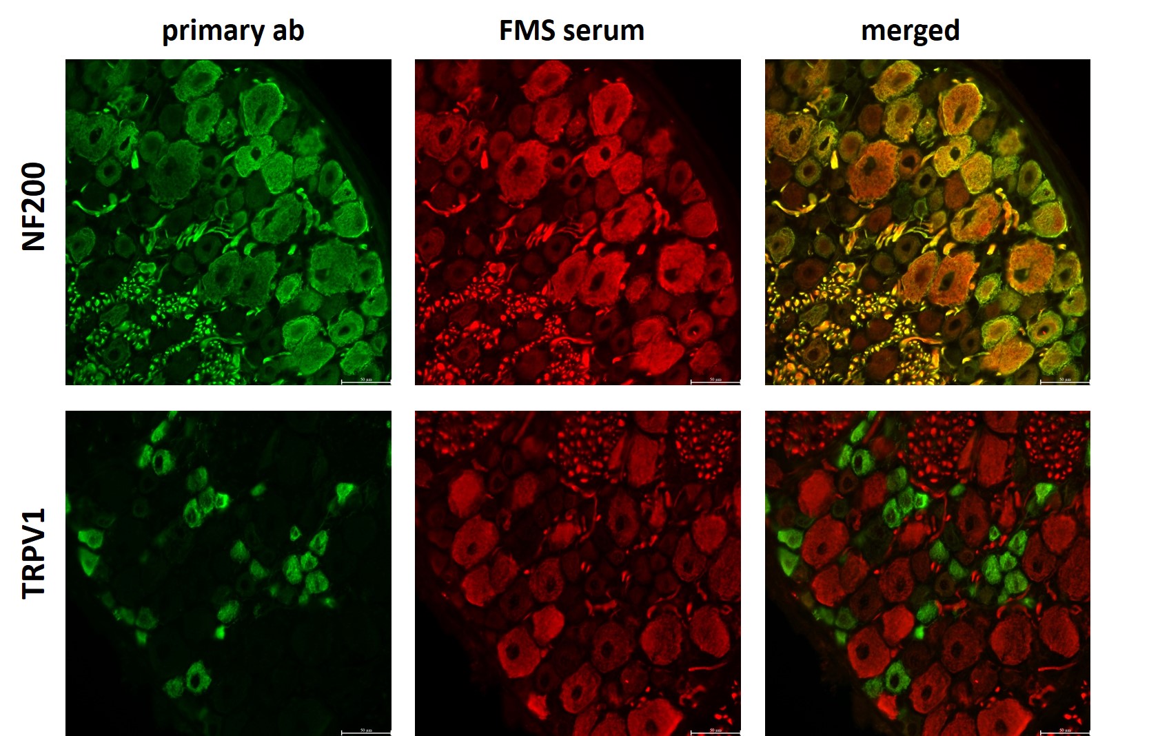 Gefrierschnitte von Spinalganglien der Ratte wurden auf die Bindung von kommerziell erhältlichen Antikörpern („Vergleichs-AK“) gegen Neurofilament 200 (NF200) und den Capsaicin-Rezeptor TRPV1 getestet. Die erste Spalte zeigt, dass NF200 erwartungsgemäß an große Neuronen und TRPV1 an kleine Neuronen bindet. Die zweite Spalte zeigt die Bindung von Serum eines Patienten mit Fibromyalgiesyndrom an diese Neuronen. Das Serum bindet hauptsächlich an große Neuronen. Die dritte Spalte zeigt die Überlagerung der beiden Färbungen. Das Patientenserum kolokalisiert mit dem Marker NF200, aber nicht mit dem Rezeptor TRPV1. Für verschiedene Patienten mit Fibromyalgiesyndrom wurden unterschiedliche Bindungsmuster gefunden. Bildquelle: C. Sommer/S. Seefried / UKW