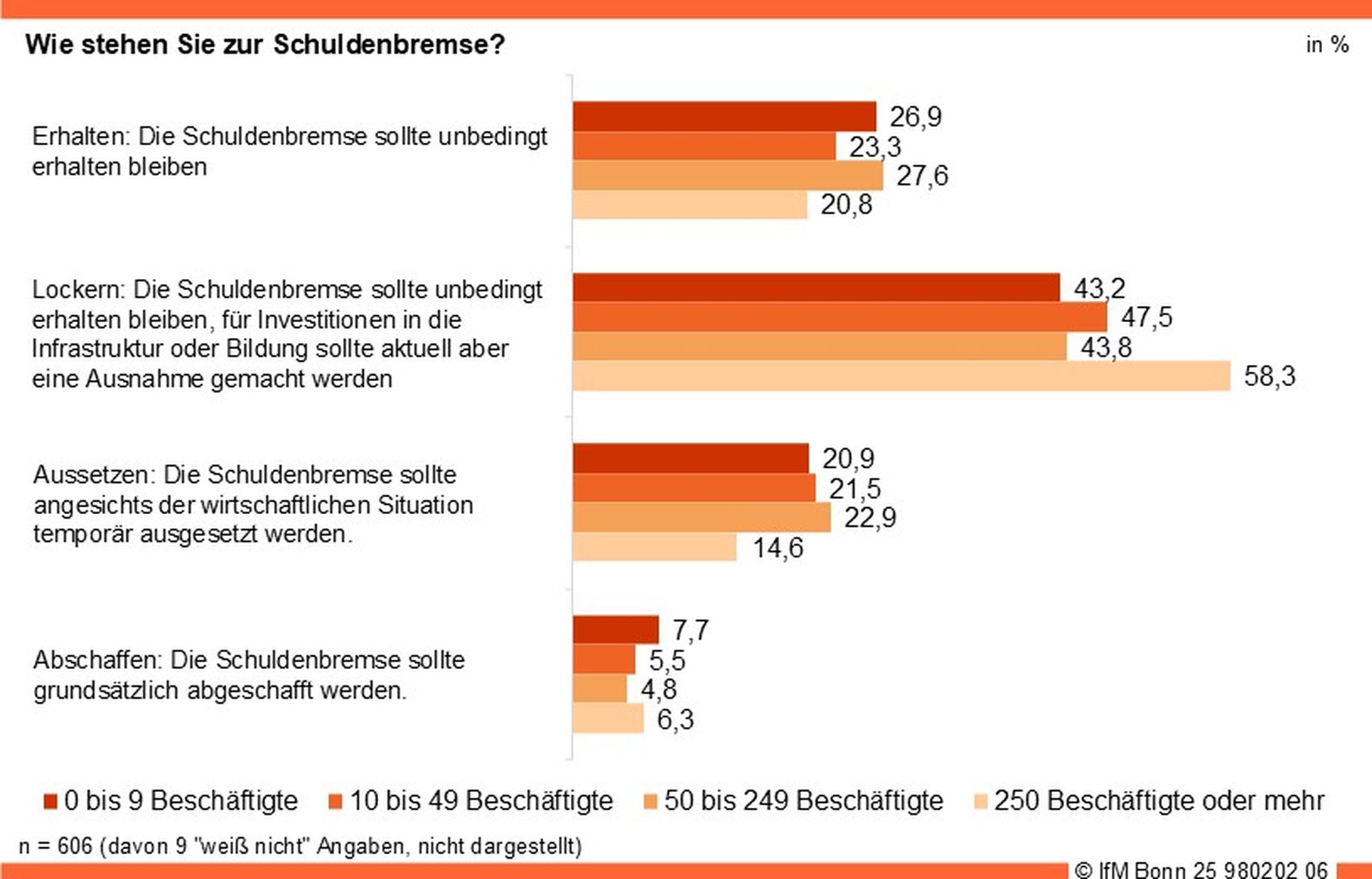 Eine generelle Abschaffung der Schuldenbremse lehnen die Geschäftsführerinnen und Geschäftsführer mehrheitlich (92 %) ab. Eine Lockerung befürwortet rund die Hälfte von ihnen im Hinblick auf gezielte Investitionen in die Infrastruktur und in das Bildungssystem. Etwas mehr als jedes fünfte Unternehmen, das die Schuldenbremse befürwortet, plädiert für deren zeitweise Aussetzung aufgrund der aktuellen, wirtschaftlichen Situation.