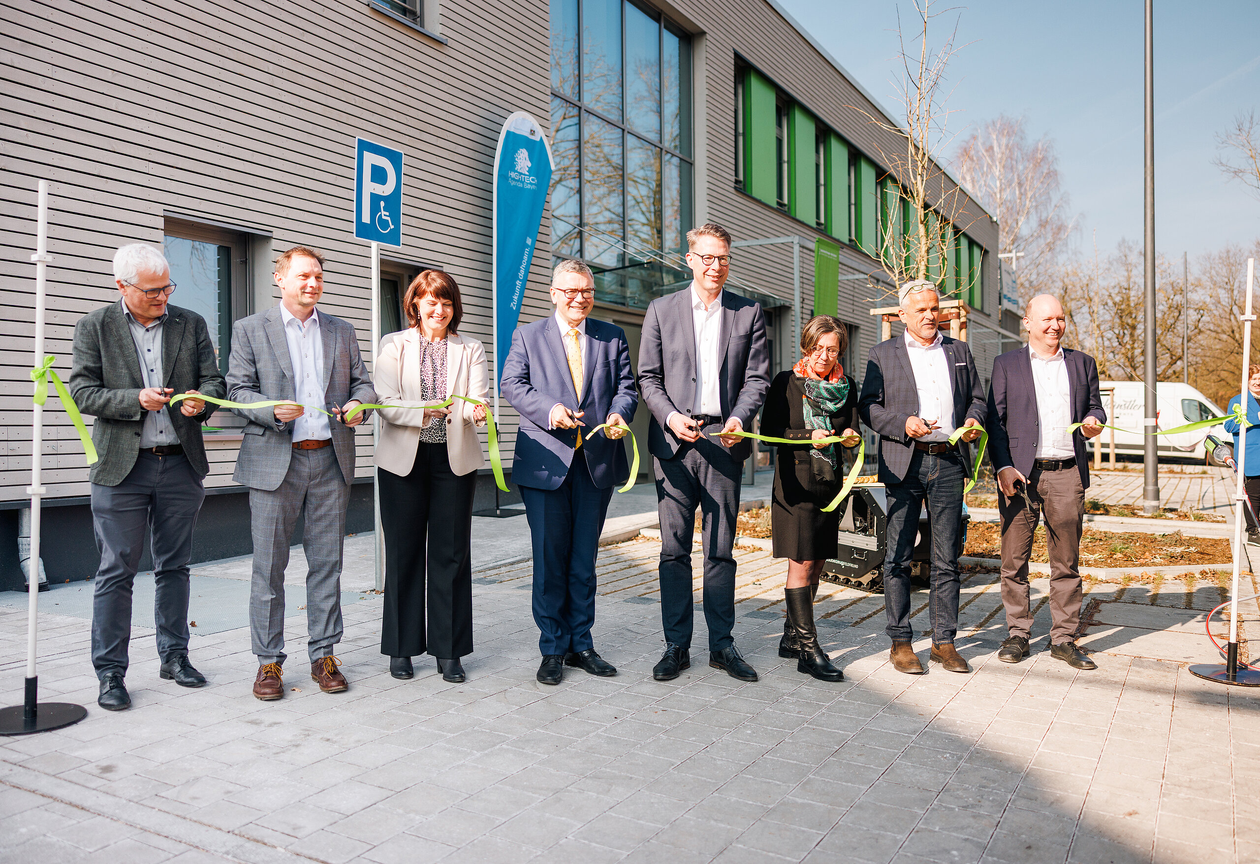 Im Anschluss daran fand der feierliche Einweihungsakt statt, bei dem Wissenschaftsminister Markus Blume, Staatsminister Dr. Florian Herrmann, Hochschulpräsident Dr. Eric Veulliet, Prof. Dr. Christoph Moning, Prof. Dr. Jörg Ewald, Dr. Michaela Stegmann, Dr. Veronika Hannus und Dr. Michael Krappmann das Eröffnungsband feierlich durchtrennten.