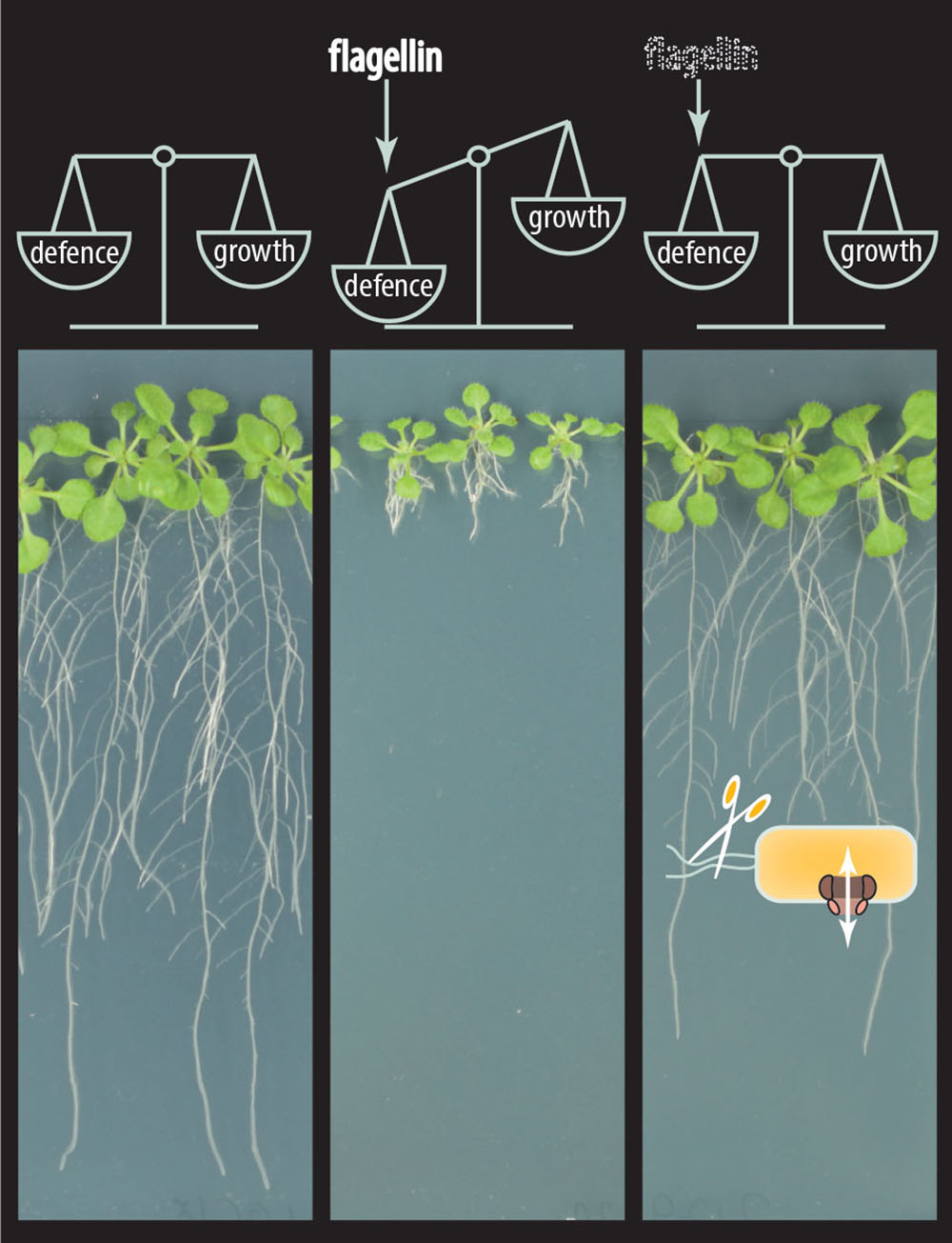 Das Immunsystem von Pflanzen ist ein hochspezialisiertes und sensibles Abwehrsystem, das darauf ausgelegt ist, krankheitserregende Mikroben abzuwehren. Daher überprüfen Pflanzen ständig ihre Umgebung auf bakterielle Merkmale, die als Alarmsignale für die Anwesenheit potenzieller Eindringlinge dienen. Eines der am besten untersuchten Erkennungsmerkmale von Bakterien ist ein Teil von Flagellin, das Bakterien zur Fortbewegung dient. Sobald Flagellin von einem Pflanzenrezeptor namens FLS2 erkannt wird, werden Immunreaktionen aktiviert, und weniger Energie für pflanzliches Wachstum zur Verfügung gestellt. Flagellin kommt jedoch nicht nur bei gefährlichen Bakterien vor, sondern auch bei sogenannten kommensalen Bakterien, die kaum, oder positive Effekte auf die Pflanze haben. Wie also können kommensale Bakterien, die auf allen Pflanzen allgegenwärtig sind und auf gesunden Pflanzen pathogene Bakterien bei weitem übertreffen, die Pflanze besiedeln? Wissenschaftler:innen haben nun ein besseres Verständnis für diesen scheinbaren Widerspruch.