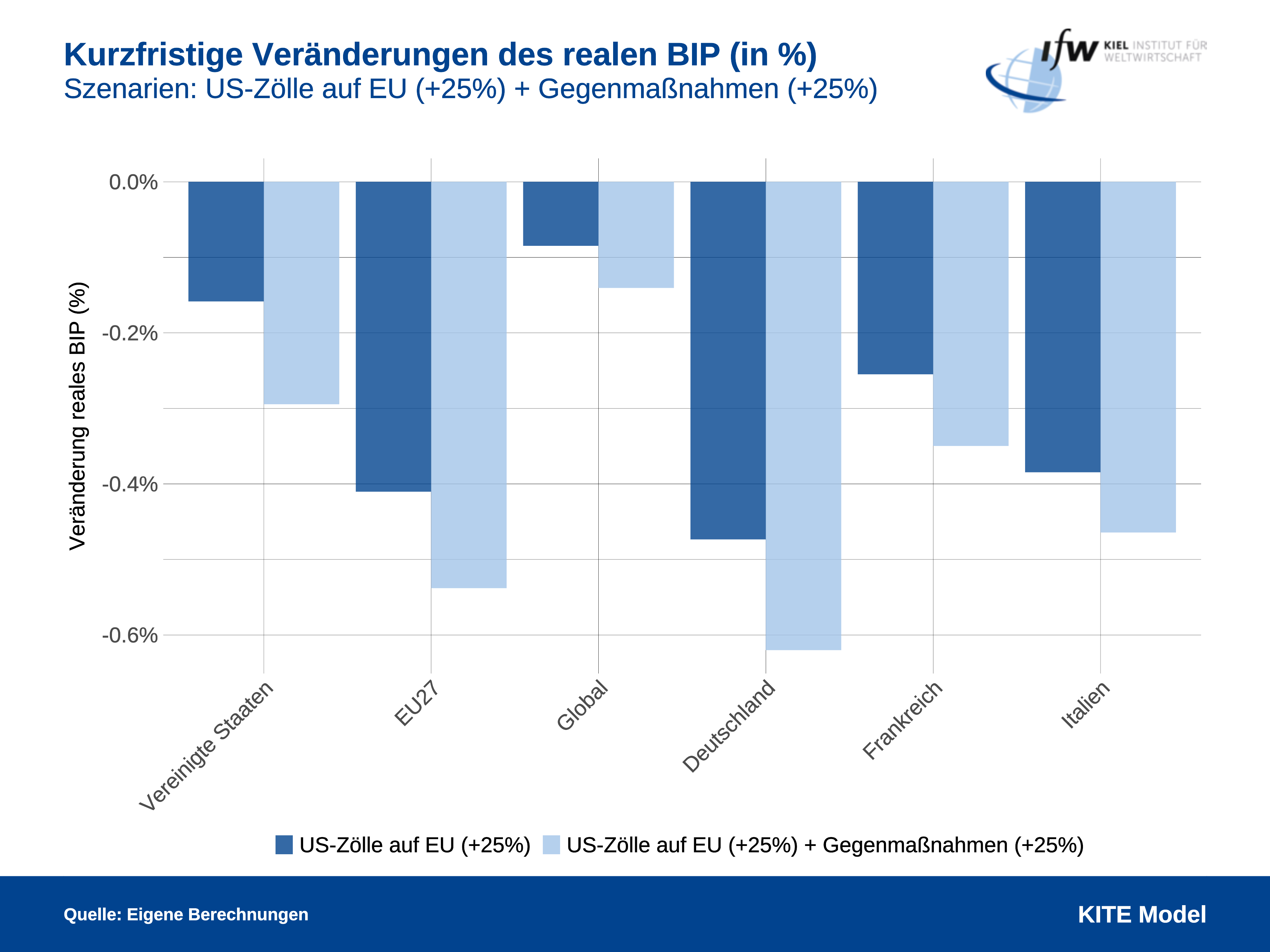 Die europäische Wirtschaft würde laut Simulationsrechnungen innerhalb des ersten Jahres im Durchschnitt um 0,4 Prozent schrumpfen, ein bedeutender Rückgang für ein kurzfristiges Szenario. Auch die USA blieben nicht verschont und müssten mit einem Rückgang des realen BIP um 0,17 Prozent rechnen. Sollte die EU mit eigenen 25-Prozent-Zöllen reagieren, würde sich der wirtschaftliche Schaden für die USA verdoppeln und die eigenen Kosten für die EU um 0,14 Prozentpunkte verstärken. Zudem könnten die Verbraucherpreise in den USA um bis zu 1,5 Prozent steigen, da nicht nur importierte Endprodukte, sondern auch teurere Vorprodukte die Produktionskosten im Inland erhöhen und die Wettbewerbsfähigkeit verringern würden.