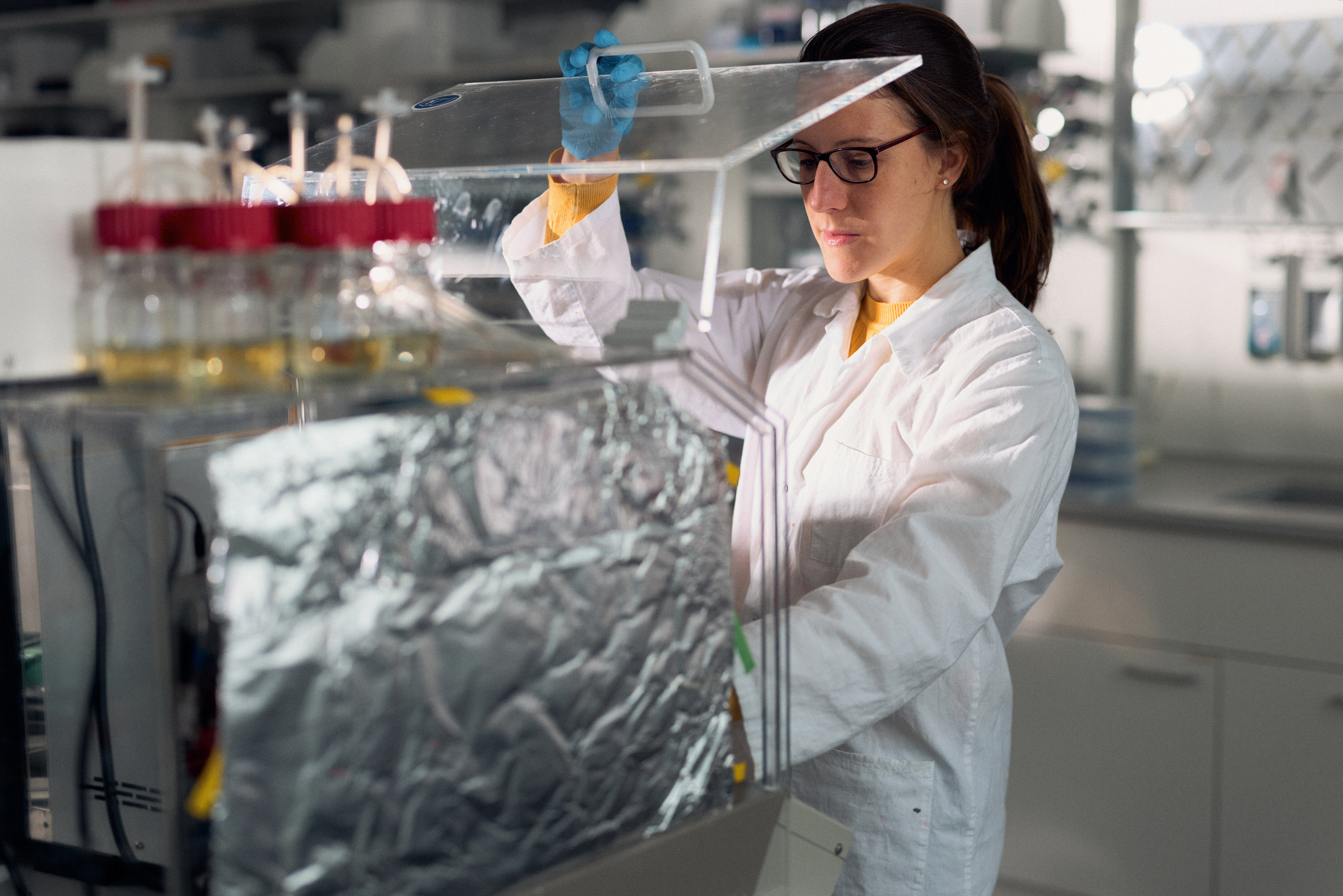 So konnten Iwanicki und Zumpano gleich nach ihrer Ankunft mit der Arbeit im Labor beginnen. „Die aktuell erhältlichen Pflanzenschutzmittel auf Pilzbasis werden durch Festphasenfermentation hergestellt“, erläutert Iwanicki. „Das heißt, die Pilze werden auf Getreidesubstrat kultiviert, was zahlreiche Einschränkungen wie eine geringe Wachstumsrate, ungleiche Nährstoffverteilung und schwierige Prozesskontrolle mit sich bringt.“ Letztlich leidet die Qualität des biologischen Pflanzenschutzmittels. Die Forscherin öffnet einen Brutschrank, holt einen Erlenmeyerkolben heraus und schwenkt ihn prüfend hin und her: „Wir setzen dagegen auf die Flüssigfermentation. Das ist die Produktion der Pilze in einer Nährstofflösung. Denn dabei produzieren sie nicht nur verschiedene infektiöse Zellen für die Schädlingsbekämpfung, auch die Industrie bevorzugt dieses Verfahren, denn es lässt sich besser automatisieren und skalieren.“