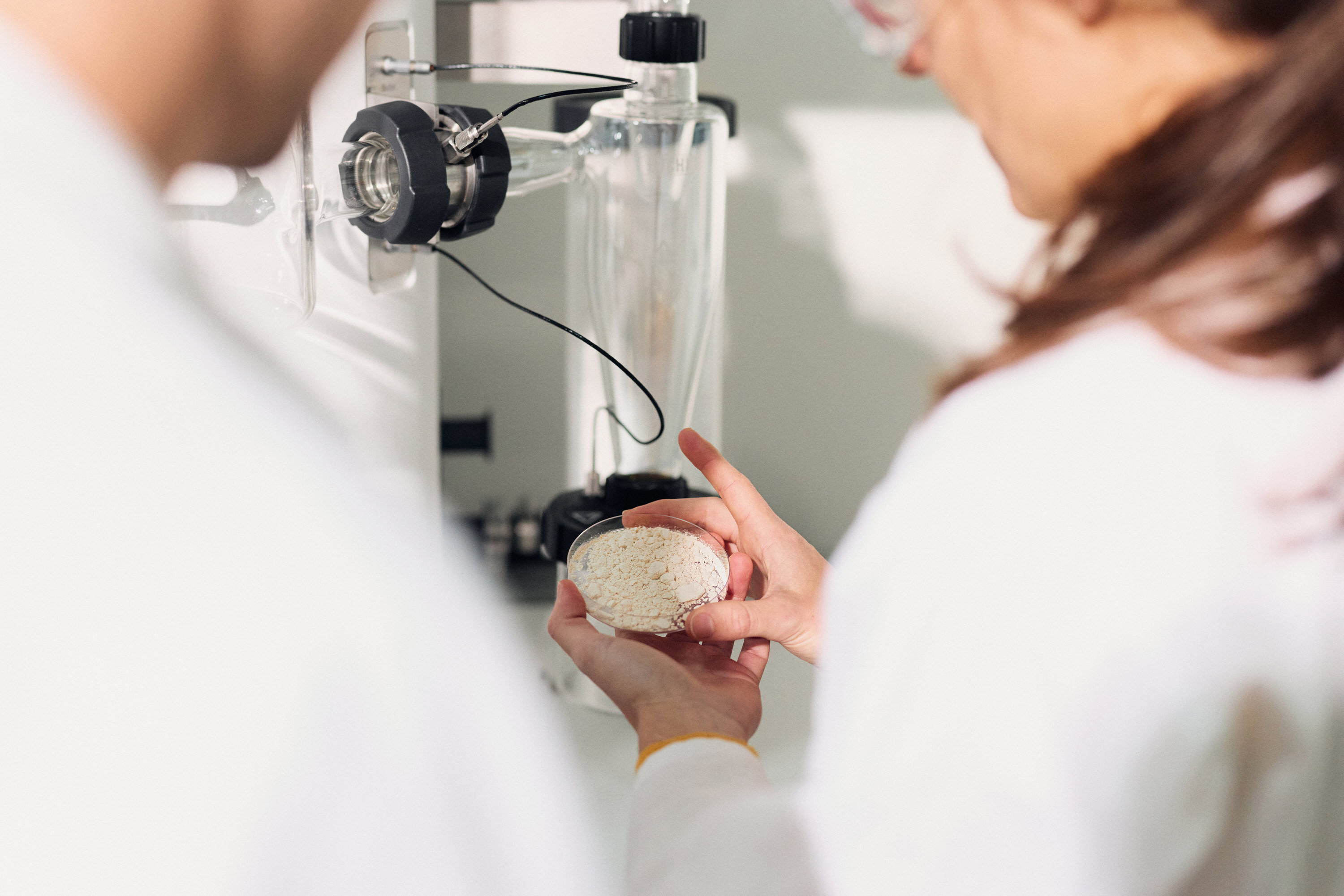 Um die optimalen Parameter für die Vorkonditionierung zu ermitteln, hieß es für die Forschenden: Experimentieren, experimentieren, experimentieren. „Wir waren von morgens bis abends im Labor“, sagt Luiz Zumpano. Er schaut aus dem Fenster zum Teutoburger Wald und lacht. „In den Wald habe ich es aber auch geschafft. Schön!“ Und schließlich hatten auch die Pilzzellen die erforderlichen Eigenschaften: Das Pulver lebt. Natasha Iwanicki freut sich: „Mit der Vorkonditionierung können wir die Lebensfähigkeit der Pilzzellen nach der Trocknung bei hohen Temperaturen deutlich verbessern.“