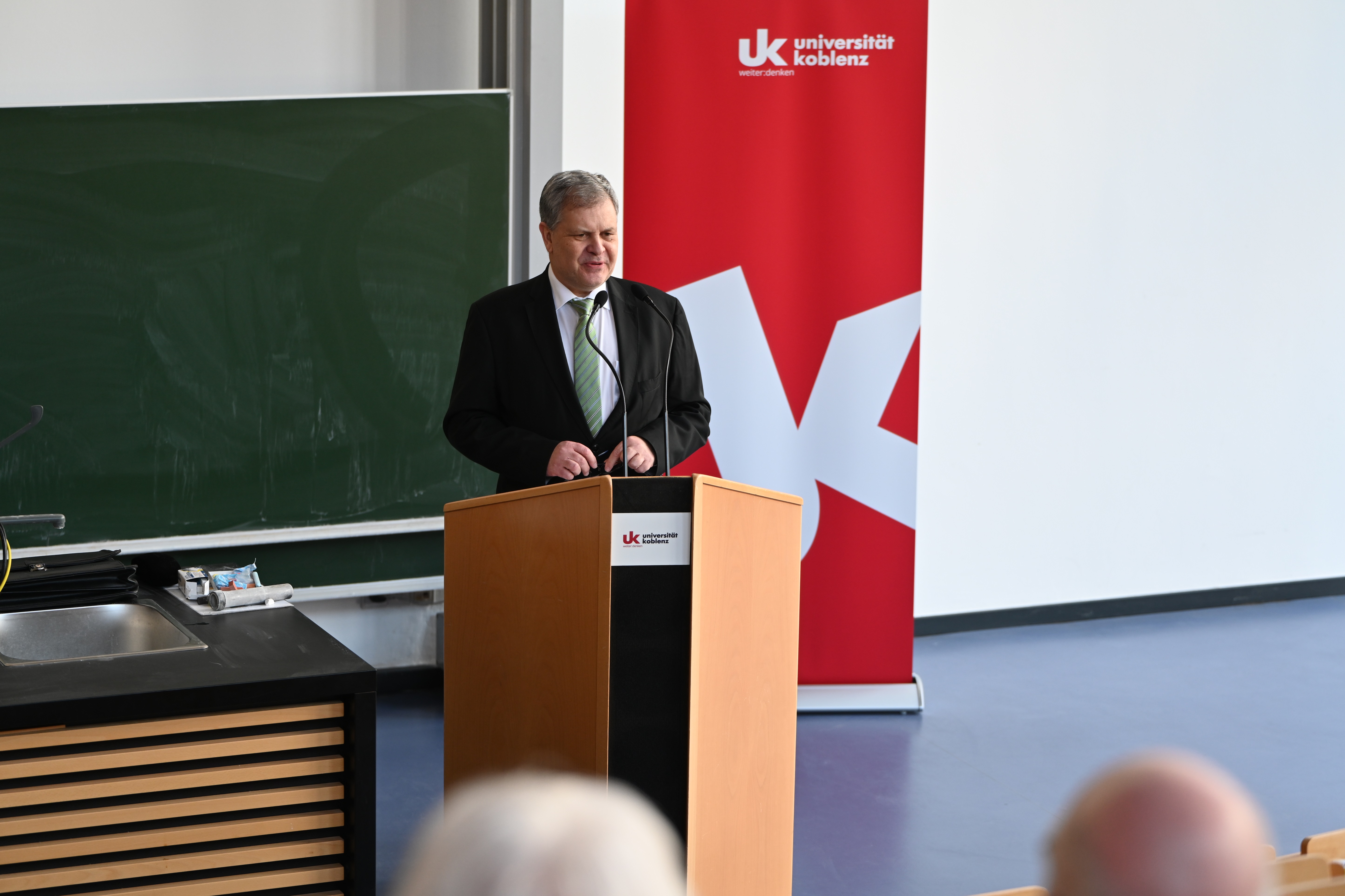 Fachbereichs-Dekan Prof. Dr. Ralf Lämmel würdigte Geis in seiner Laudatio als „Pionier der Justizdigitalisierung“ in Deutschland. „Dr. Ralf Geis hat durch seine langjährige und vielseitige Tätigkeit im Bereich des Öffentlichen Rechts, sowohl in der Praxis als auch in der Wissenschaft, herausragende Leistungen erbracht. Seine Arbeiten zur Digitalisierung der Justiz und seine interdisziplinäre Herangehensweise machen ihn zu einem wertvollen Kandidaten für die Honorarprofessur. Seine Lehrtätigkeit an der Universität Koblenz zeigt, dass er in der Lage ist, komplexe juristische Inhalte verständlich und praxisnah zu vermitteln. Zudem hat Dr. Geis den Fachbereich durch seine langjährige Unterstützung und sein Engagement in der Lehre maßgeblich gefördert“, führte Lämmel aus.