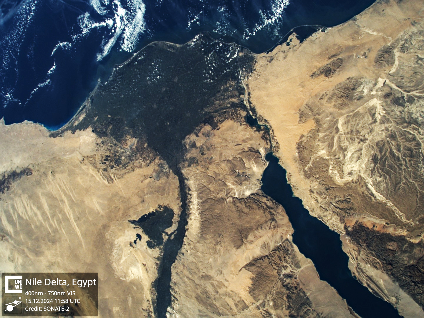 The Sahara was selected as the target region for detecting anomalies. The satellite first took 270 photos and stored them in two data sets of 90 and 180 images. Two AI models were then trained and anomaly detection was carried out with each. SONATE-2 reliably recognized objects that do not normally occur in a desert, such as the Nile and the adjacent green region.