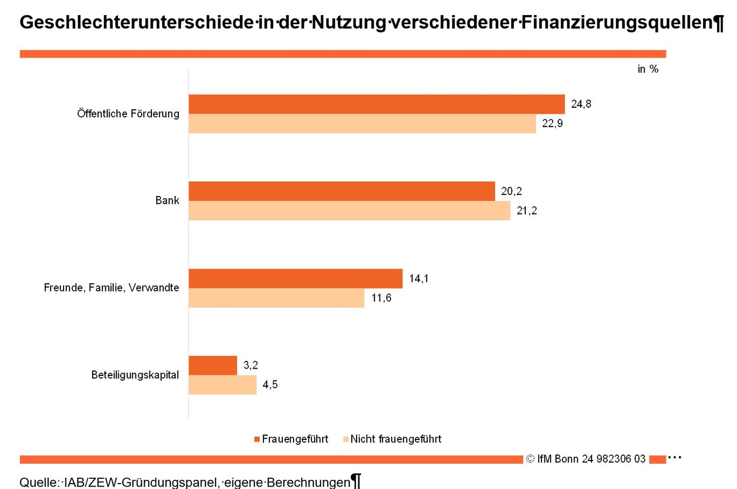 "Die Erfolgschancen, einen Kredit zu erhalten, sind prinzipiell bei beiden Geschlechtern gleich hoch", berichtet Dr. Rosemarie Kay, stellvertretende Geschäftsführerin des Instituts für Mittelstandsforschung (IfM) Bonn. Auf Basis des IAB/ZEW-Gründungspanels hat sie mit ihrem Forschungsteam die Nutzung verschiedener Finanzierungsquellen für junge Unternehmen untersucht. Dabei zeigte sich auch, dass frauengeführte Unternehmen häufiger als männergeführte Unternehmen auf öffentliche Förderungen oder die finanzielle Unterstützung aus dem privaten Umfeld (Freunde und Familie) zurückgreifen.