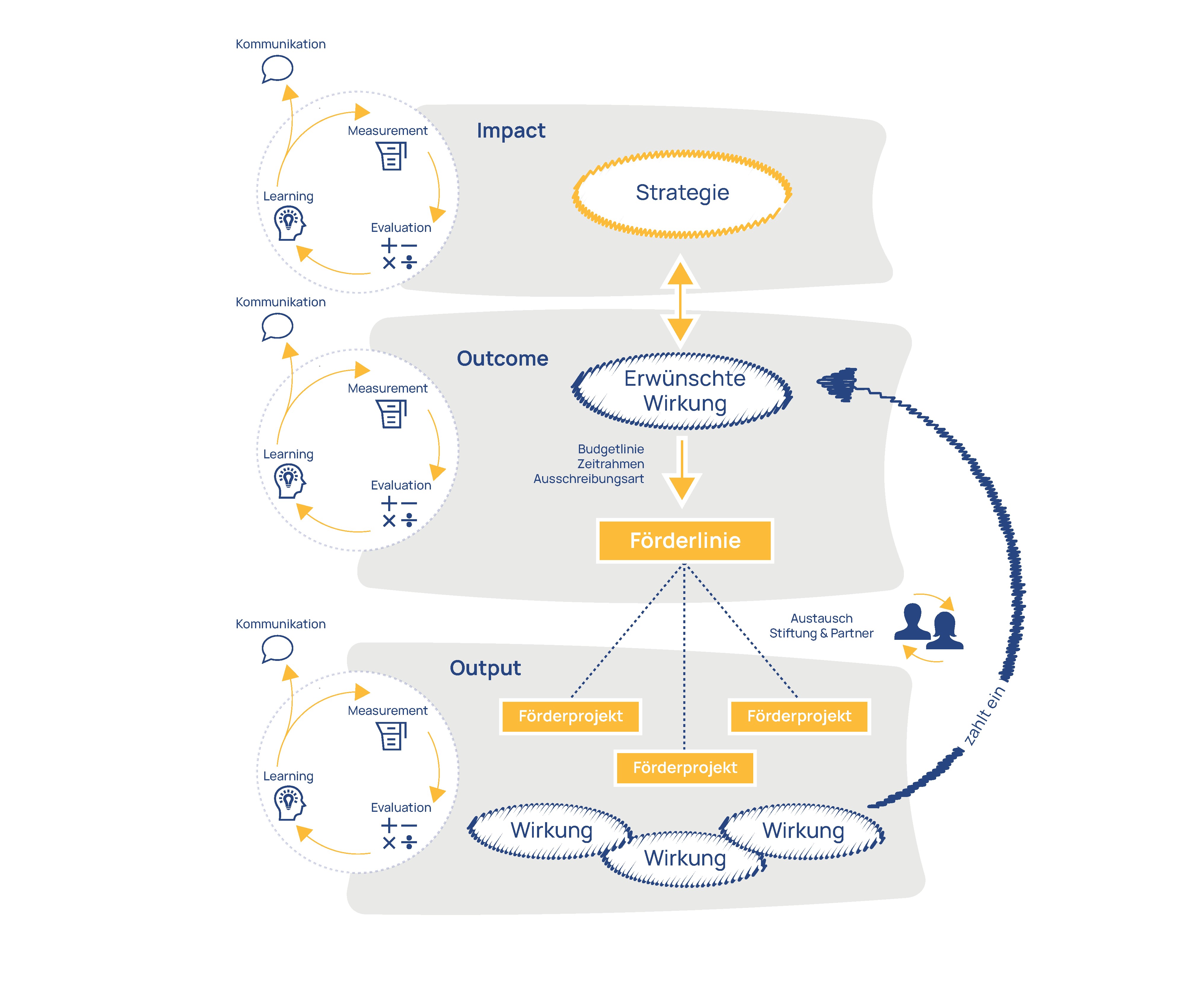 Die angehängte Grafik veranschaulicht den Prozess des neuen Fördermanagements der Klaus Tschira Stiftung. Aus den strategischen Leitlinien leiten sich konkrete erwünschte Wirkungen in der Gesellschaft ab, aus denen einzelne Förderlinien entstehen. Auf diese können sich potentielle Förderempfangende mit ihren Projektideen bewerben. Am Ende jeder Förderphase prüfen die Förderreferentinnen und -referenten, inwieweit die erzielten Wirkungen den Zielvorstellungen entsprechen. Jede einzelne Stufe dieses Prozesses wird evaluativ mit sogenannten MEL-Zyklen (links abgebildet) begleitet, um die Abläufe nachhaltig zu optimieren.