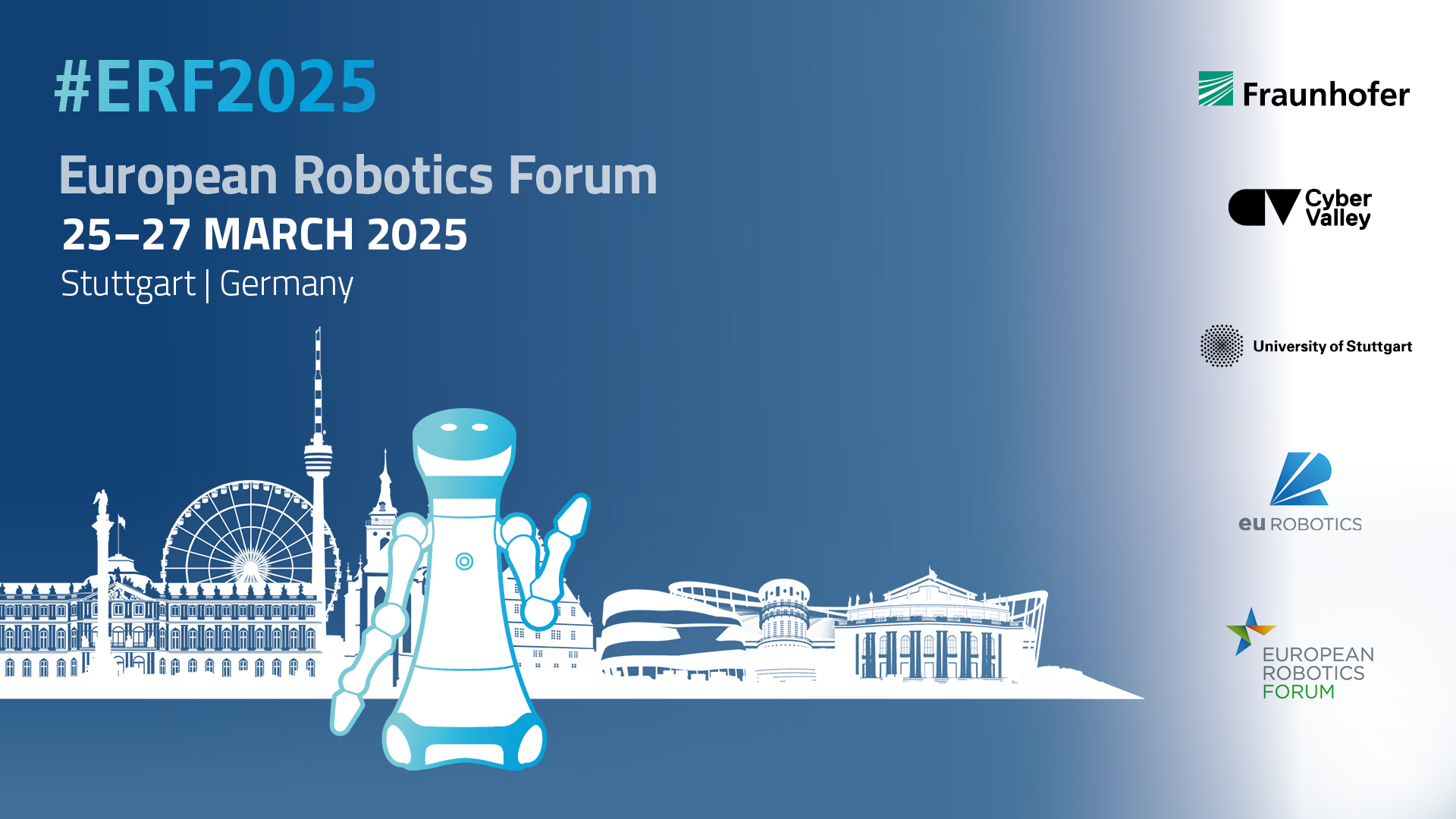 Vom 25. bis 27. März 2025 findet das hochkarätige »European Robotics Forum« des europäischen Roboterverbands euRobotics in der Stuttgarter Liederhalle statt. Zahlreiche Partner, prominente Gäste, ein breit gefächertes Programm und ein großer kostenfreier Beitrag zum Public Engagement am Nachmittag des 24. März machen Stuttgart zum wichtigsten Treffpunkt für Industrie, Wissenschaft und interessierte Öffentlichkeit rund um die Themen Robotik und KI.